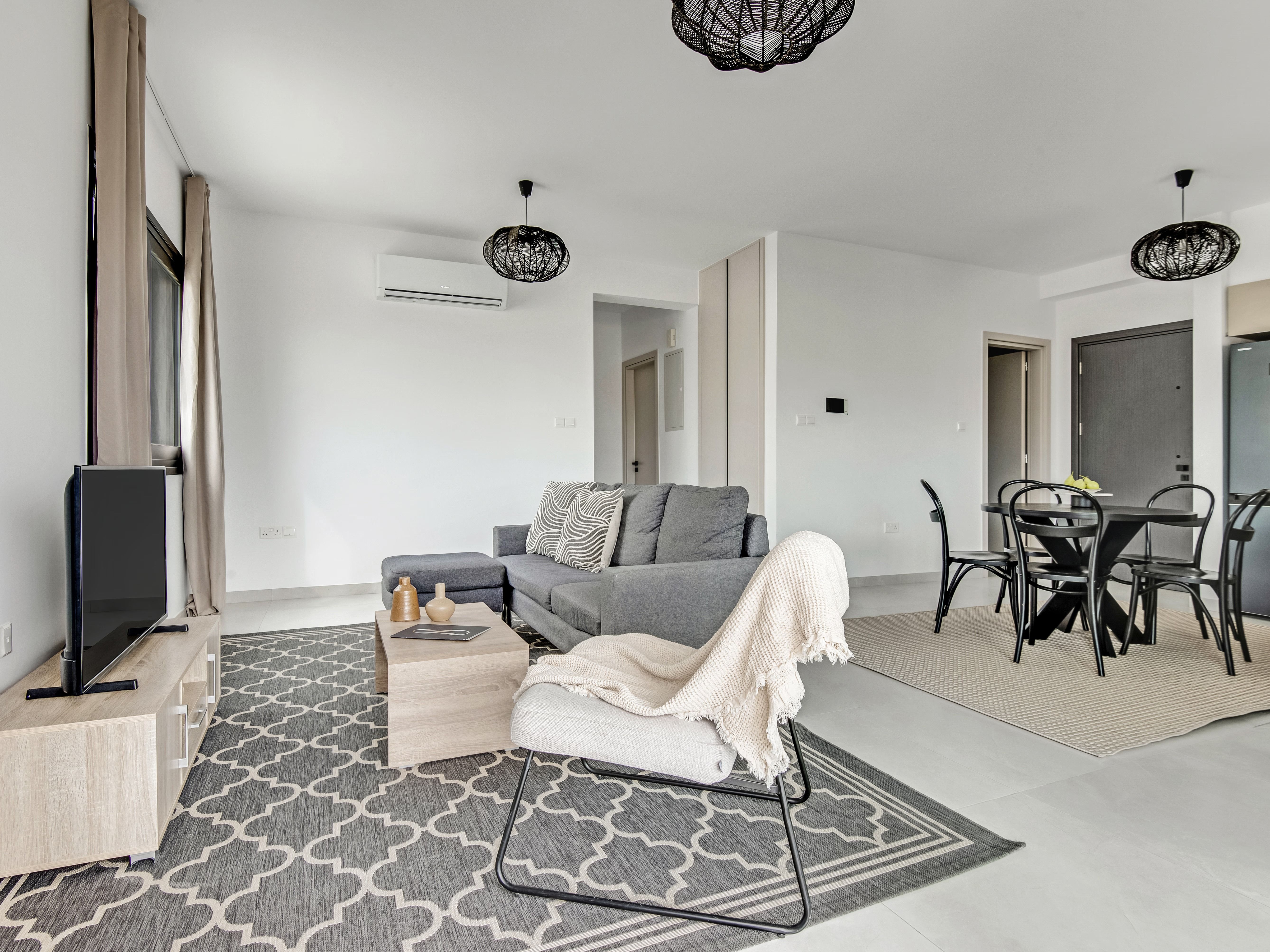 This stylish apartment in Limassol is perfect for couples or small groups looking to enjoy the city’s seaside charm. The home is cosy, yet bright and comfortable, with a contemporary open-plan living space, a fully equipped kitchen, and not one, but two private balconies, ideal for enjoying the ocean air. It's set in a central location, within easy reach of the beach, Limassol Marina, and the Old Town, with many shops, cafes, and restaurants. It's a great base for exploring this Mediterranean gem.
