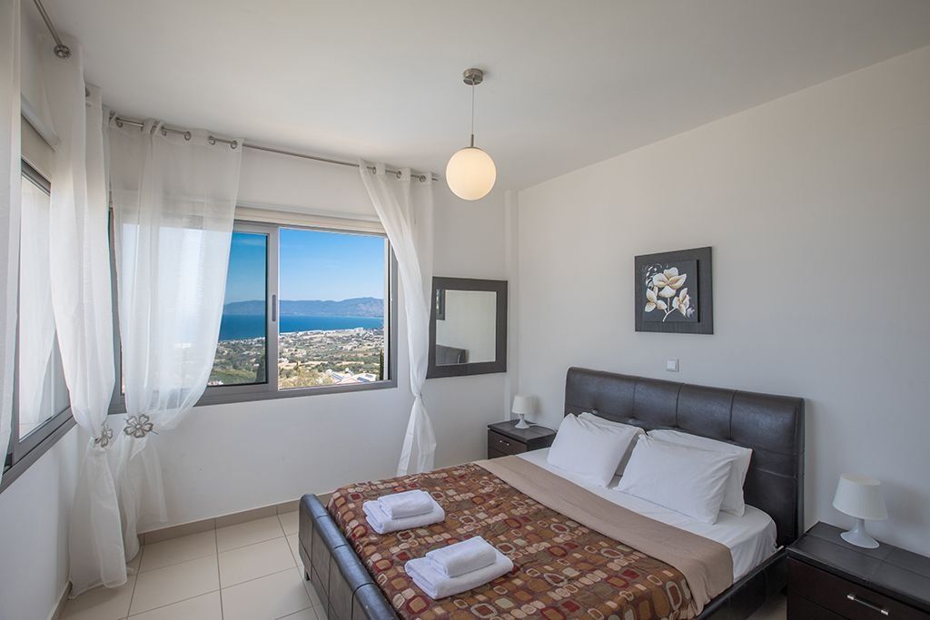 Downstairs, the villa features an open-plan living area which enjoys spectacular sea views along with soft furnishings, satellite TV, a DVD player and an open fireplace. The dining area seats 6 and the contemporary kitchen features all main appliances needed for a comfortable self-catering stay. A double bedroom and separate bathroom with shower and bathtub is also located on the ground floor.