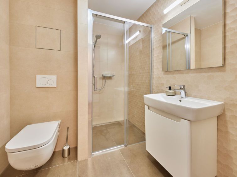 1-room studio 30 m2 on 1st floor. Very beautiful and modern furnishings: living/sleeping room with 1 double sofabed and 1 double bed. Kitchenette (oven, dishwasher, 4 induction hot plates, toaster, kettle, microwave, electric coffee machine). Shower/WC. Heating. Small balcony. Balcony furniture.