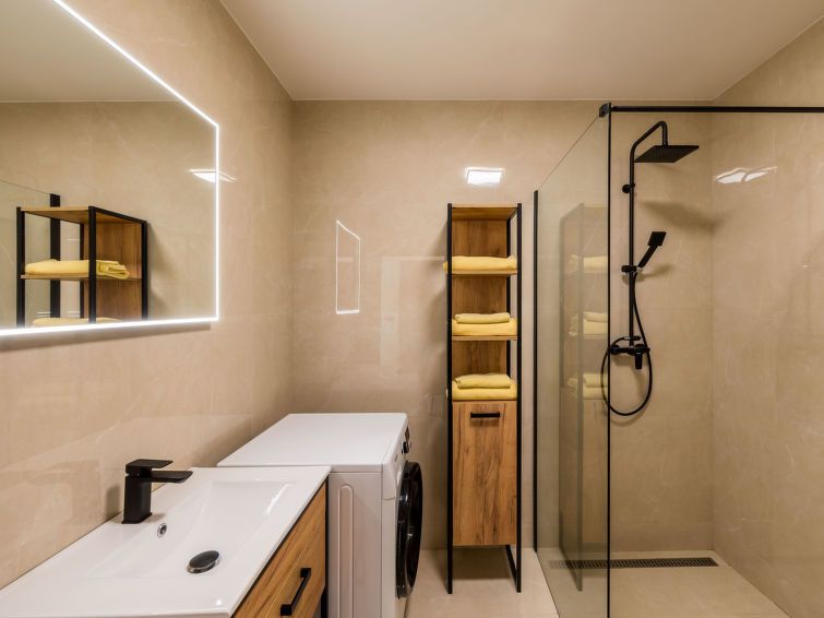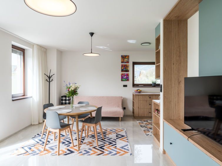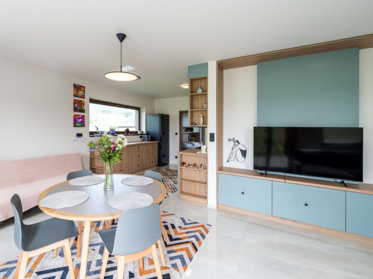 "Happy", 2-room apartment 50 m2, on the ground floor. Comfortable and beautiful furnishings: living/dining room with 1 sofabed and TV. 1 room with 1 double bed and 2 pull-out beds. Kitchenette (oven, dishwasher, 4 ceramic glass hob hotplates, kettle, freezer, electric coffee machine) with dining table.