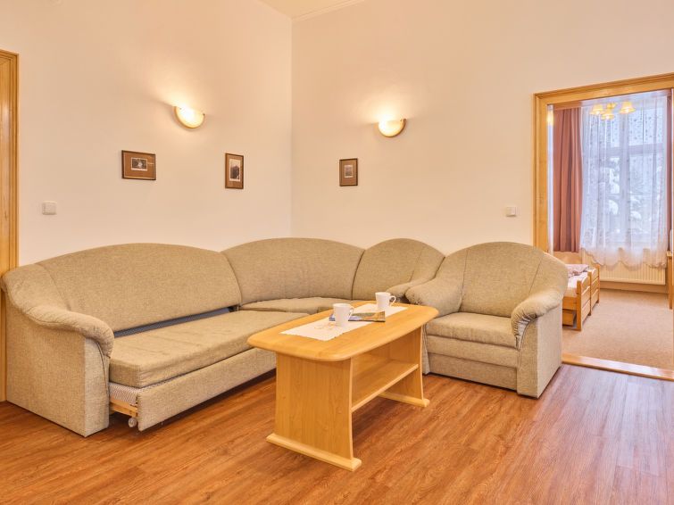 3-room apartment on the ground floor. Stylish and cosy furnishings: living/sleeping room with 1 double bed and shower/WC. Living/sleeping room with 2 beds. Kitchen-/living room (1 ceramic glass hob hotplate, kettle, freezer) with 1 sofabed. Wooden floors. Suitable for families. Maximum 1 pet/ dog allowed..