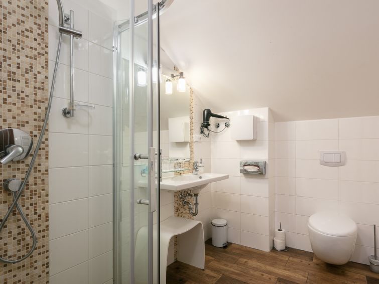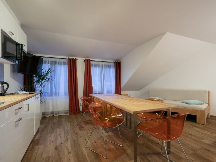 "U Kabinky 6+2", 2-room apartment 63 m2 on 3rd floor. Living room with 1 double sofabed, 1 double bed and TV. 1 room with 2 beds and 1 double bed. Kitchenette (2 hot plates, kettle, microwave) with dining table. Shower/WC. Beautiful view of the countryside. Facilities: Internet (WiFi, free).