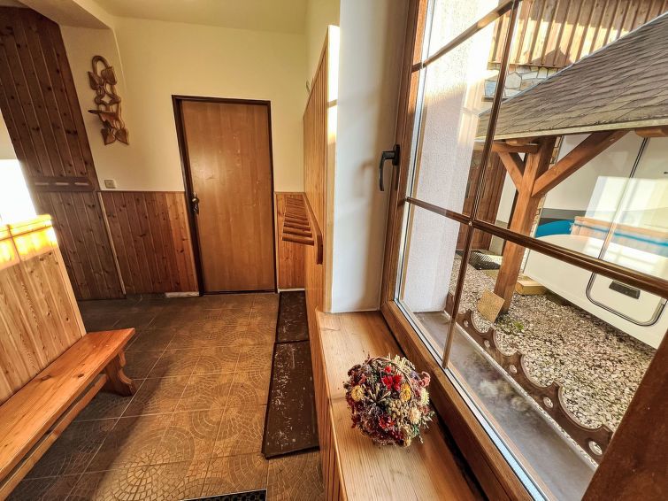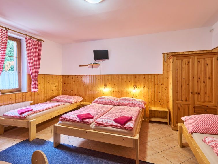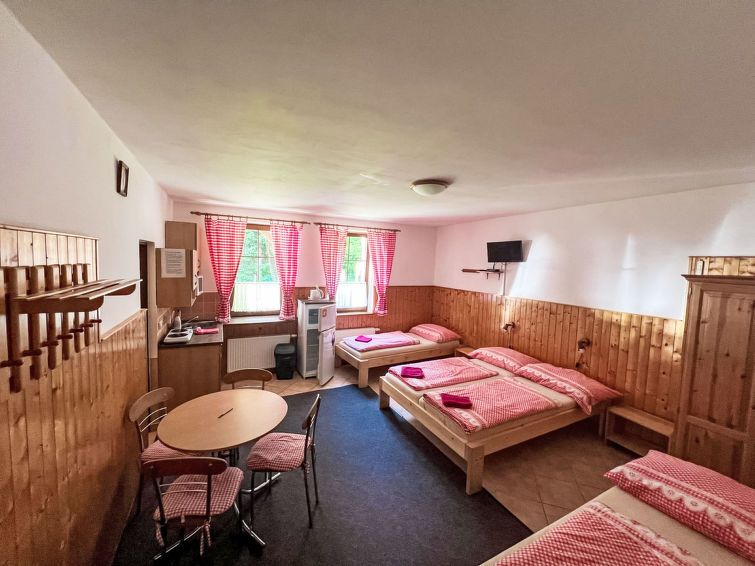"U Švýcarského dvora III", 1-room apartment 27 m2, on the ground floor. Practical and cosy furnishings: 1 room with 2 beds, 1 double bed, dining table and satellite TV. Kitchenette (2 hot plates, kettle, microwave). Shower/WC. Heating. View of the garden. Facilities: Internet (WiFi, free).
