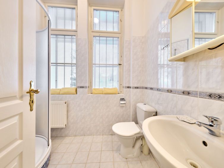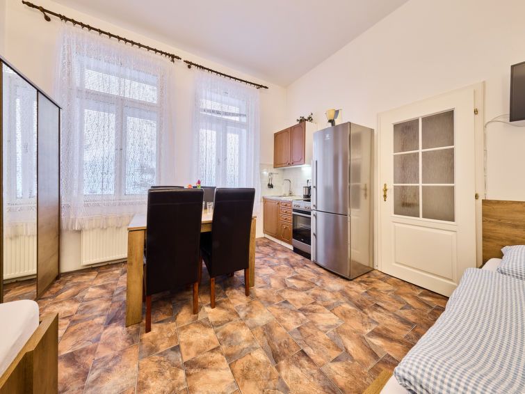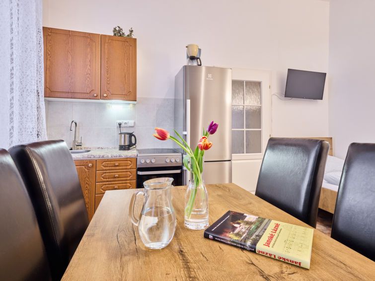 2-room apartment on 1st floor. Bright, beautiful furnishings: 1 room with 1 double bed and TV. Kitchen (oven, 4 ceramic glass hob hotplates, electric coffee machine) with 2 beds and TV. Shower/WC. Facilities: Internet (WiFi, free). Please note: suitable for families. TV only CS.