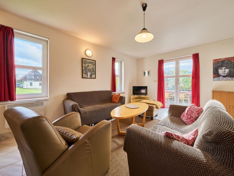 4-room chalet 100 m2 on 2 levels. Bright, cosy furnishings: living room with open-hearth fireplace, satellite TV and flat screen. Exit to the terrace. Open kitchen (4 hot plates, toaster, kettle, microwave, freezer, electric coffee machine) with dining table. Bath/WC, sep. WC. Electric heating.