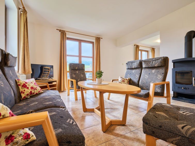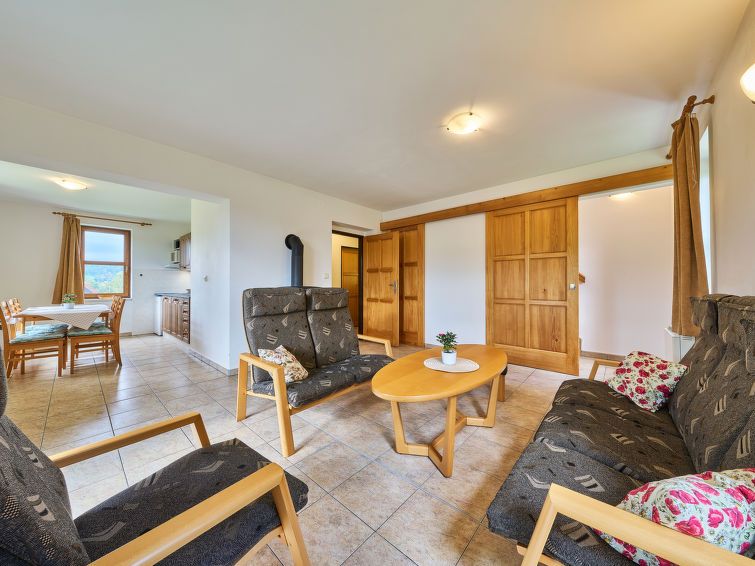 4-room chalet 100 m2 on 2 levels. Bright, fully renovated, cosy furnishings: living room with Scandinavian wood stove, satellite TV and flat screen. Exit to the terrace. Open kitchen (4 hot plates, toaster, kettle, microwave, freezer, electric coffee machine) with dining table. Bath/WC, sep.