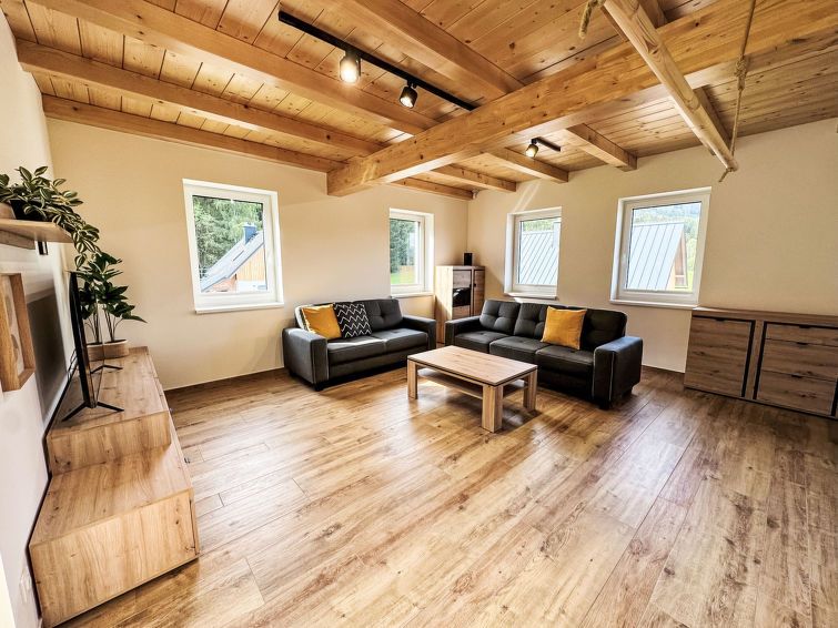 "13ka Sunny Lodge", 7-room cottage on 2 levels. Very comfortable and modern furnishings: open large living room with 1 sofabed, Scandinavian wood stove, dining table and satellite TV. Exit to the terrace. Kitchenette (dishwasher, 4 induction hot plates, toaster, kettle, freezer, electric coffee machine, Capsules for coffee machine (Nespresso)).