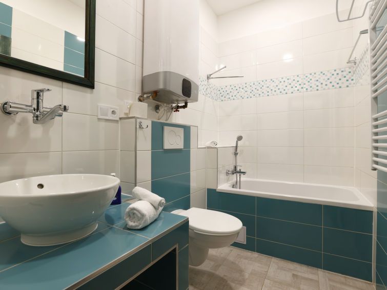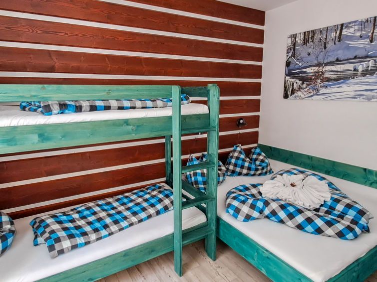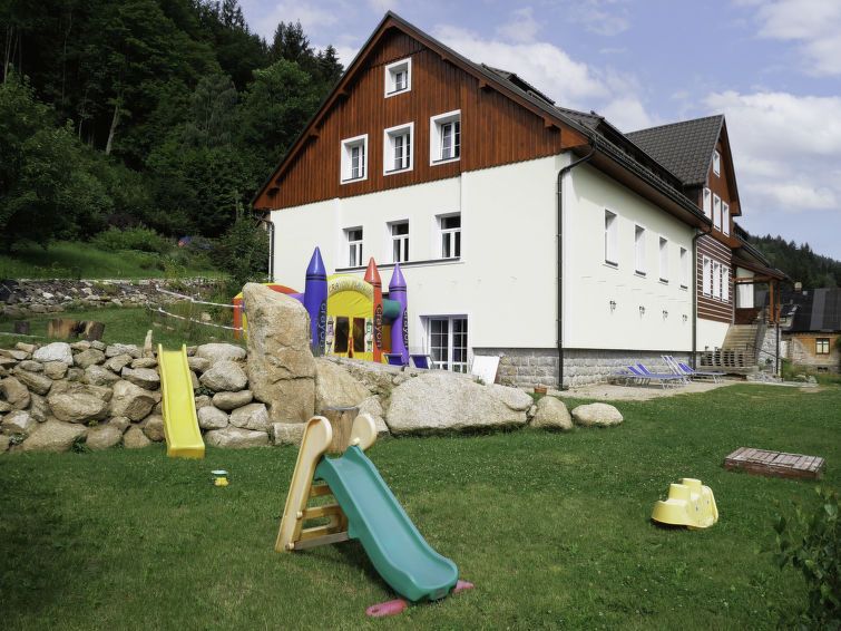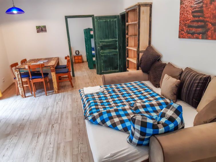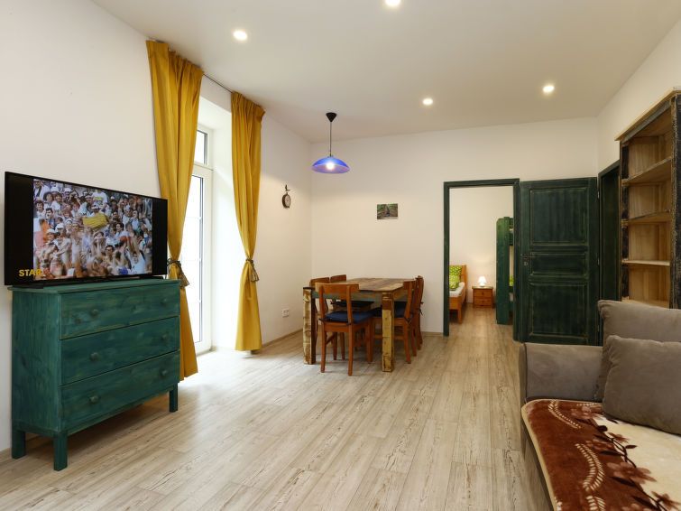 "Mariánské schody", 2-room apartment 45 m2 on 1st floor. Modern furnishings: with 1 x 2 bunk beds, 1 double bed. Exit to the terrace. Living/dining room with 1 sofabed and TV. Exit to the terrace. Kitchen (oven, dishwasher, 4 ceramic glass hob hotplates, toaster, kettle, microwave, freezer).