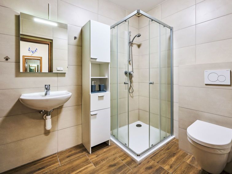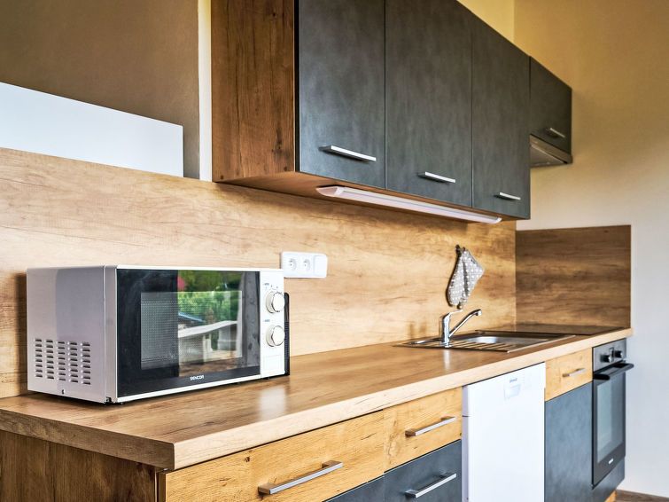 2-room apartment on the ground floor. Modern furnishings: open living room with panoramic window with 1 sofabed and TV. Exit to the terrace. 1 room with 2 beds and 1 x 1 bunk beds. Kitchenette (oven, dishwasher, 4 ceramic glass hob hotplates, kettle, microwave, freezer, electric coffee machine) with dining table.
