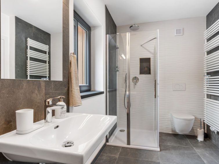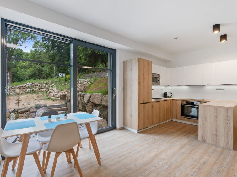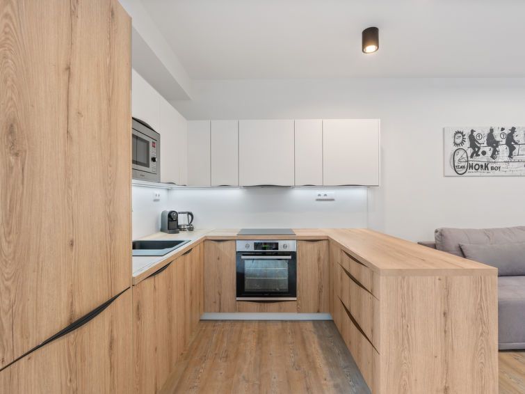 "4", 2-room maisonette 87 m2 on 2 levels, on the ground floor. Very comfortable and modern furnishings: large living/dining room with 1 sofabed and open-hearth fireplace (only for decoration), dining table, TV and electric heating. Exit to the terrace. Kitchenette (oven, dishwasher, 4 ceramic glass hob hotplates, toaster, kettle, microwave, freezer, electric coffee machine).