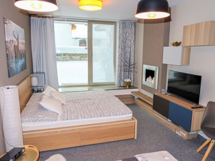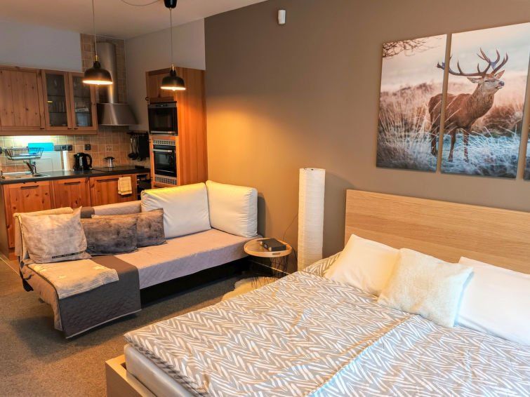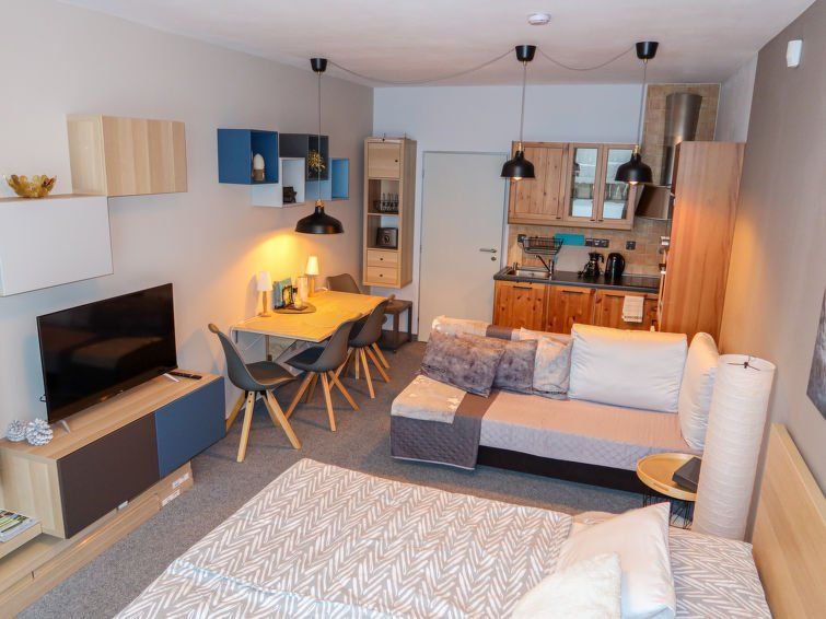 "Čertovka U jelena", 1-room studio 40 m2, on the ground floor. Comfortable furnishings: living/sleeping room with 1 double bed and open-hearth fireplace (only for decoration), TV and gas heating. Exit to the terrace. Kitchenette (4 ceramic glass hob hotplates, toaster, kettle, microwave) with dining table.