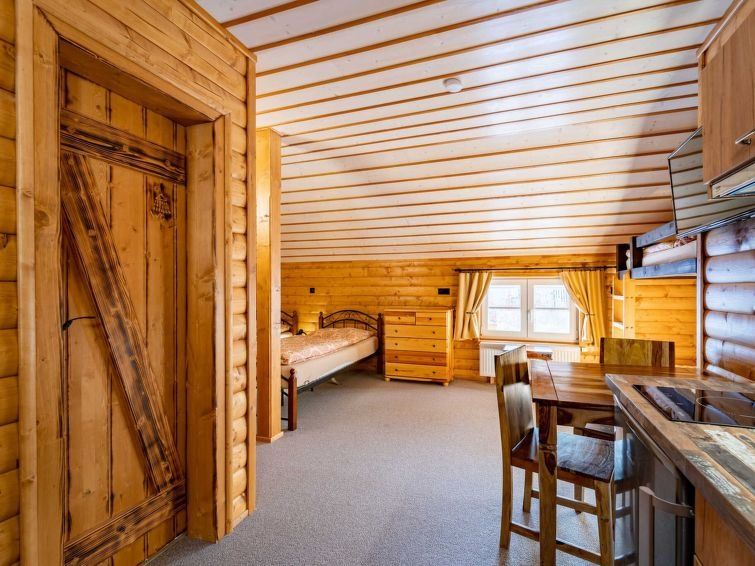 8-room chalet on 2 levels. Very beautiful and luxurious furnishings: 2 rooms, each room with 2 x 2 bunk beds, 1 double bed, shower/WC and TV. Playroom. Kitchen-/living room (dishwasher, 4 ceramic glass hob hotplates, kettle, microwave) with dining table and TV. Sauna. Upper floor: 3 rooms, each room with 4 beds, dining table, kitchen corner, shower/WC and TV.
