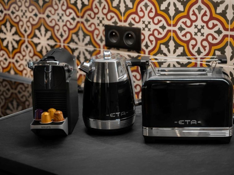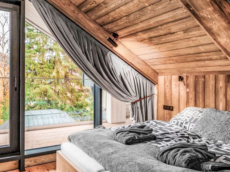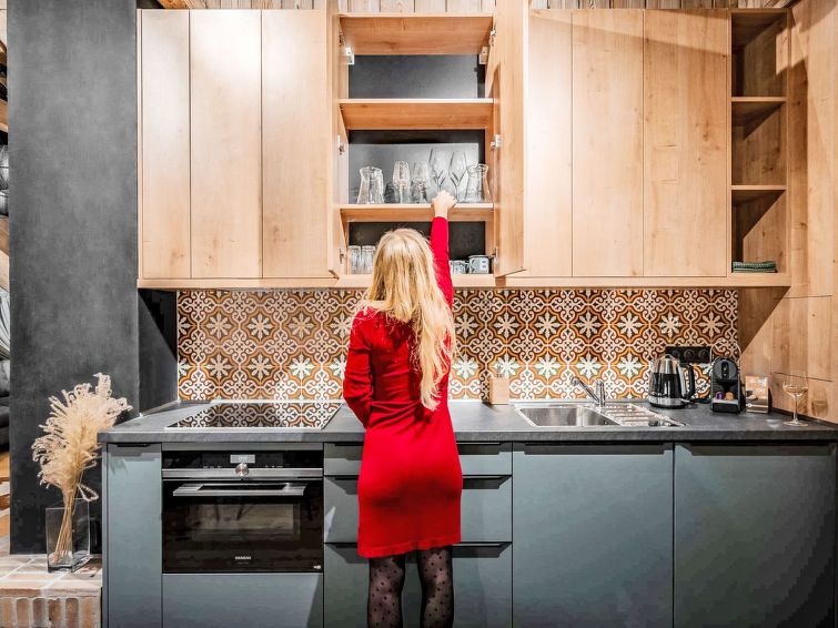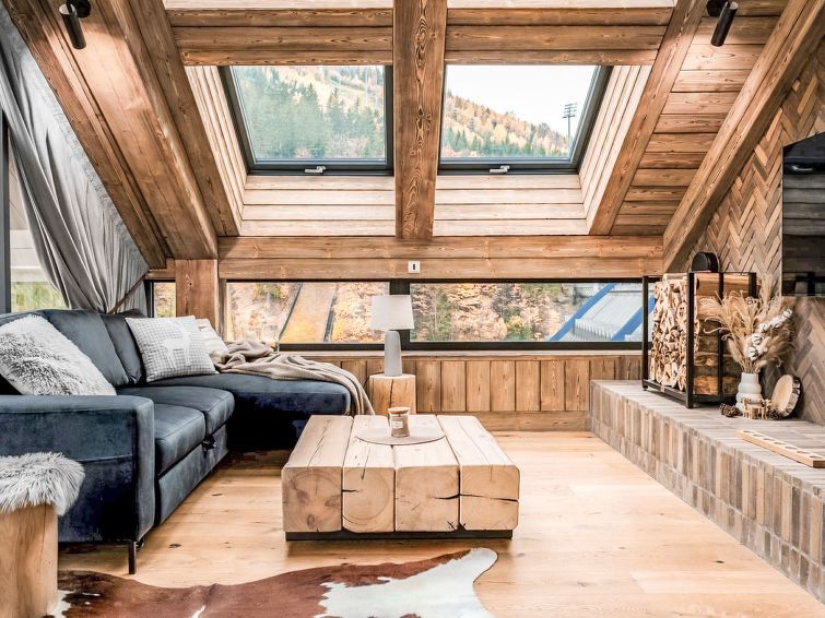 "Corso", 2-room apartment on 4th floor. Very comfortable and beautiful furnishings: large living/dining room with panoramic window with 1 sofabed, open-hearth fireplace and TV. Exit to the terrace. 1 room with 1 bed and 1 double bed. Exit to the terrace. With sloping ceilings, open kitchen (oven, dishwasher, 4 ceramic glass hob hotplates, toaster, kettle, microwave, freezer, electric coffee machine) with dining table.