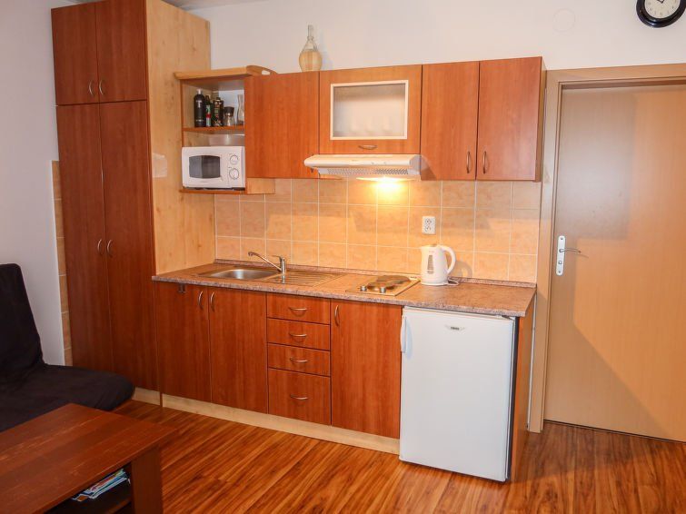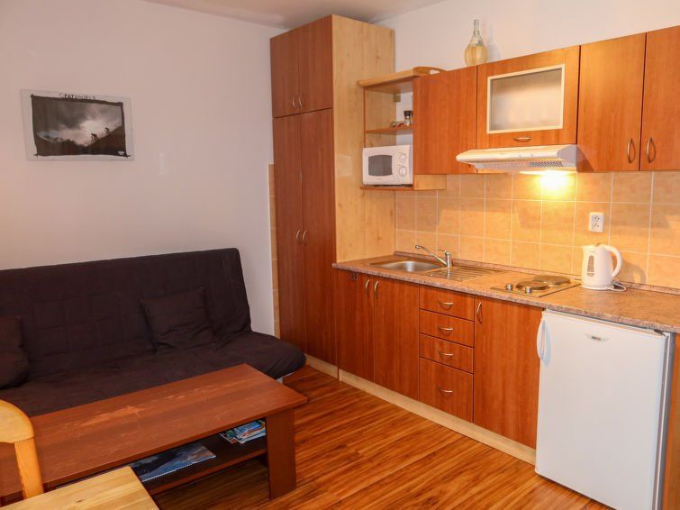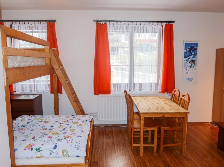 1-room studio. Cosy furnishings: open living/sleeping room with 1 double sofabed and 1 x 2 bunk beds (130 cm), 1 double bed. Kitchenette (2 hot plates, kettle, microwave) with dining table, 1 sofabed. Shower/WC. Electric heating. Facilities: Internet (WiFi, free). Suitable for families..