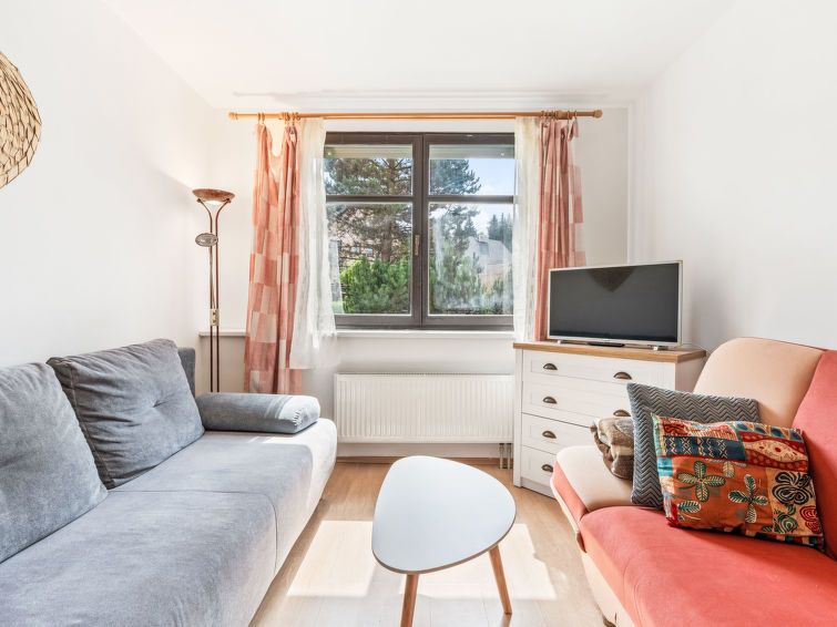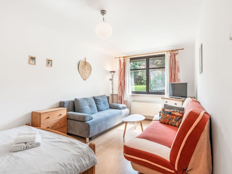 "Pet Friendly Nest", 1-room apartment on the ground floor. Practical furnishings: 1 room with 2 double sofabeds, 1 double bed, satellite TV and gas heating. Kitchen (2 hot plates, toaster, kettle, microwave) with dining table. Shower/WC. Heating. Facilities: Internet (WiFi). Parking.
