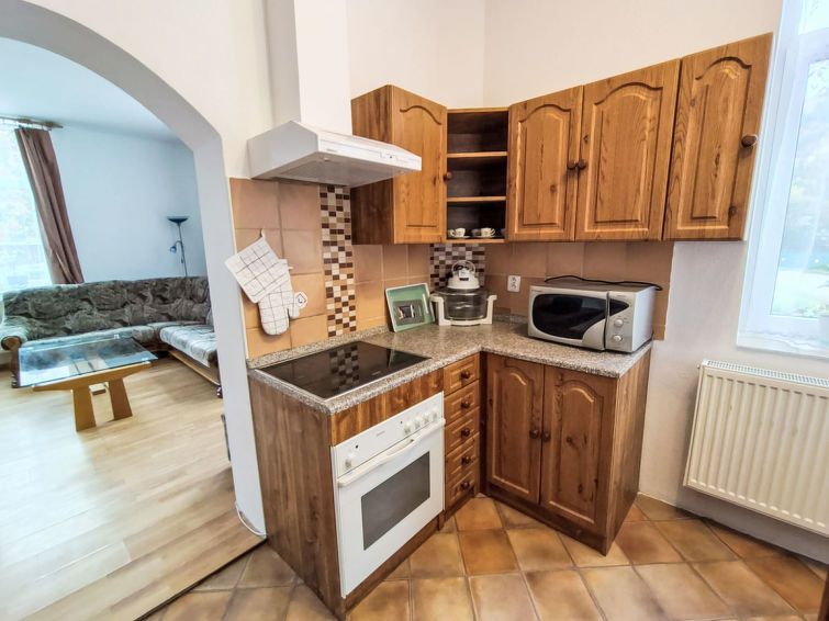 "Riedlovka 2", 2-room apartment on the ground floor. Beautiful and rustic furnishings: large living room with TV. 1 small room with 1 double bed. Kitchen (oven, dishwasher, 4 ceramic glass hob hotplates, toaster, kettle, microwave, freezer) with dining table. Bathroom, sep. WC. Heating.