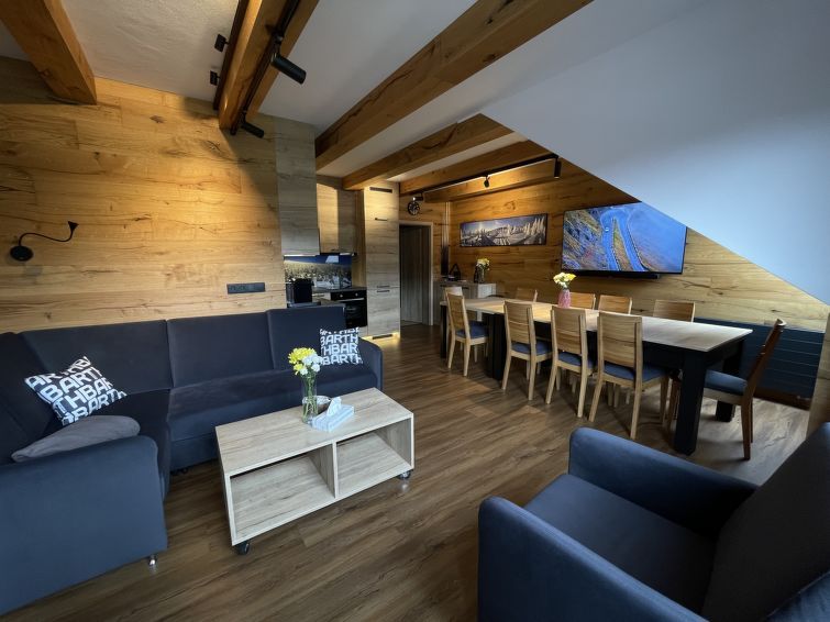 "Špindlerův Mlýn 61", 5-room maisonette 130 m2 on 2 levels, on the top floor. Renovated, luxurious furnishings: living room with sloping ceilings with dining table and TV. Exit to the balcony. 1 room with 1 x 2 bunk beds, 1 double bed and 1 pull-out bed. Kitchenette (oven, dishwasher, 4 ceramic glass hob hotplates, microwave, freezer, electric coffee machine).