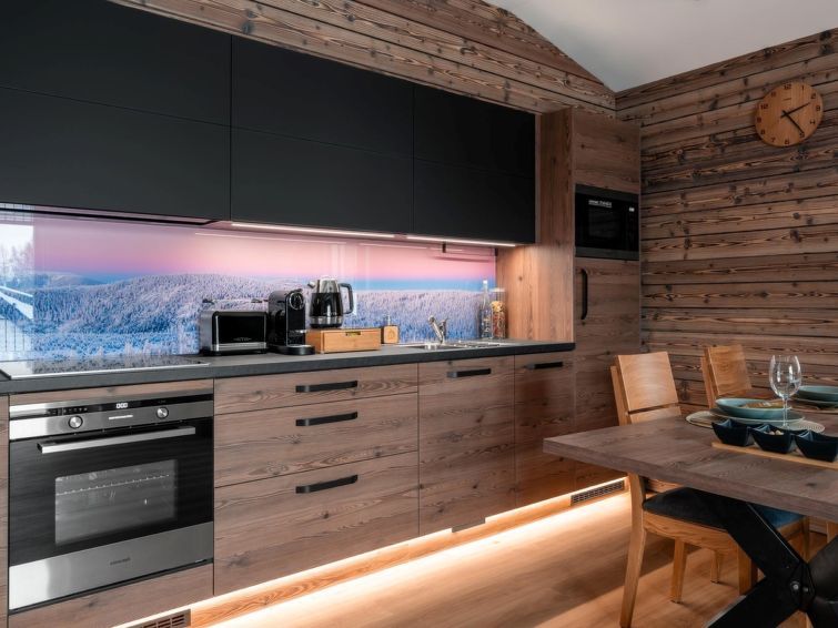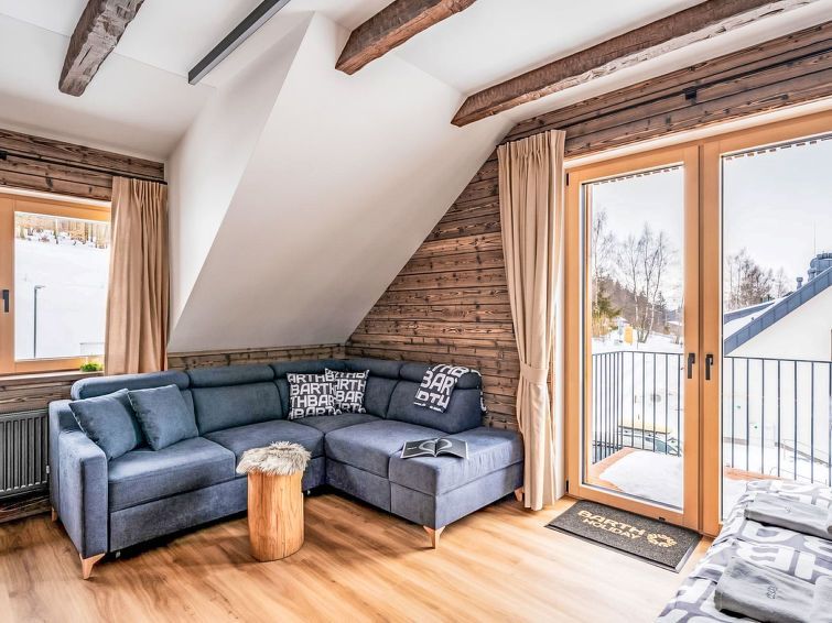 "Dolní Morava", 1-room apartment 45 m2 on 1st floor. Cosy and wooden furniture furnishings: entrance hall. Living/sleeping room with 1 x 2 bunk beds, 1 double bed and TV. Exit to the balcony. Kitchenette (oven, dishwasher, 4 ceramic glass hob hotplates, kettle, microwave, electric coffee machine) with dining table.