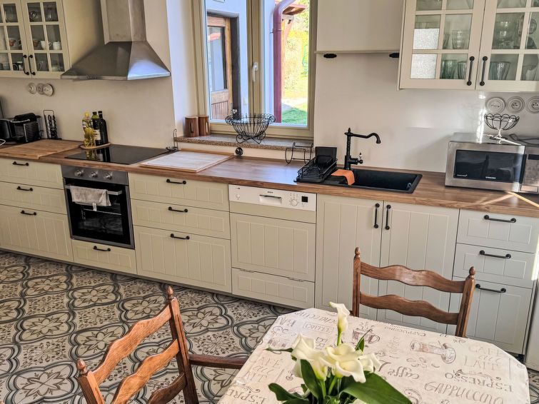 5-room house 200 m2 on 2 levels. Spacious, fully renovated in 2018, comfortable and beautiful furnishings: living room with TV (flat screen). 1 room with 1 bed and 1 double bed. Kitchen (oven, dishwasher, 4 ceramic glass hob hotplates, kettle, microwave, electric coffee machine) with tiled stove.