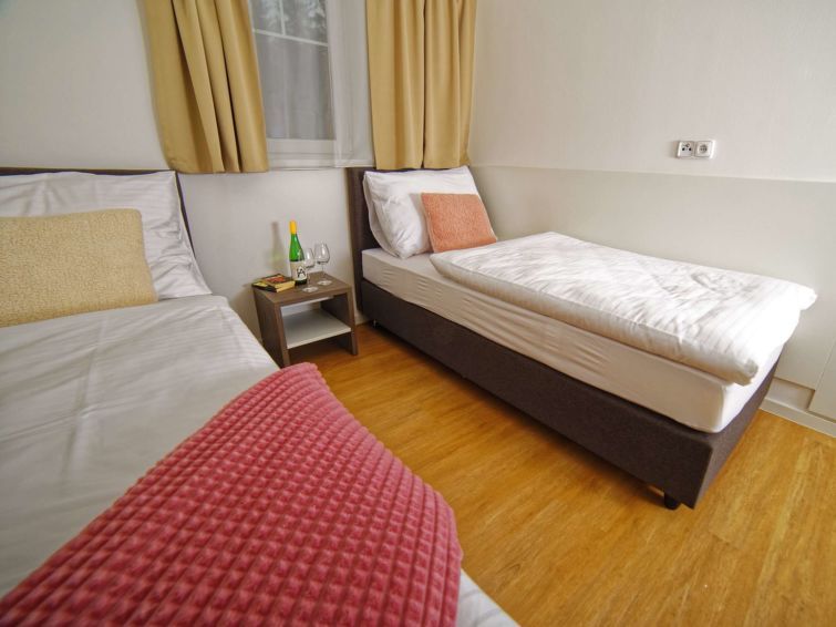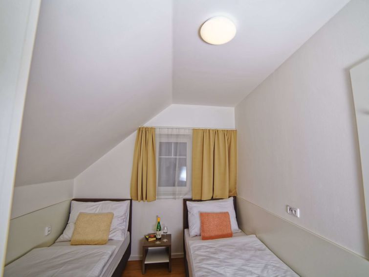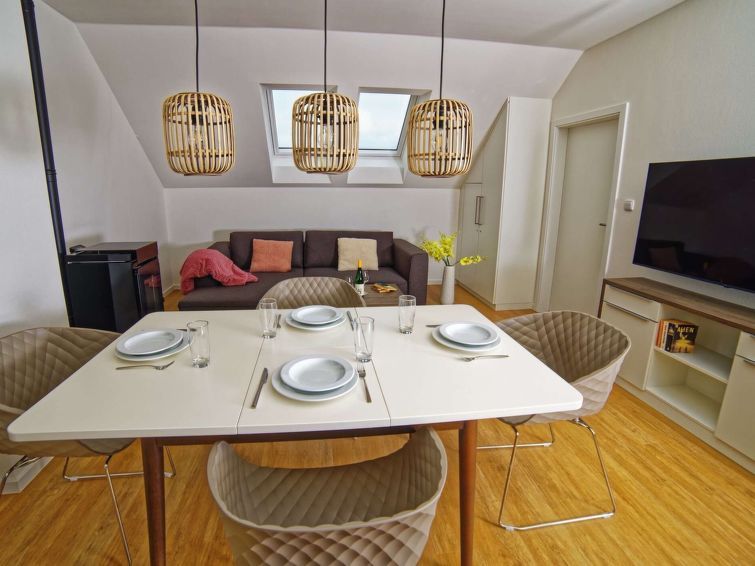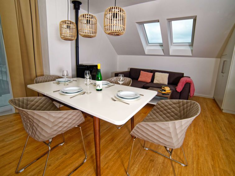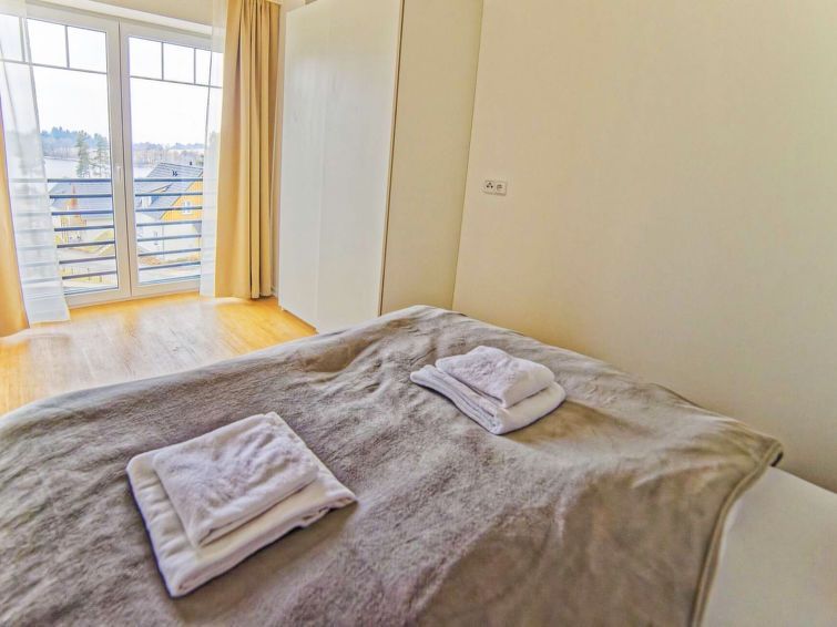 "Lakeside Village 17", 3-room apartment on the top floor. Comfortable and cosy furnishings: living room with sloping ceilings with Scandinavian wood stove. 1 room with 1 double bed. 1 room with sloping ceilings with 2 beds. Kitchenette (4 hot plates, oven, dishwasher, kettle, microwave, electric coffee machine) with dining table, satellite TV.