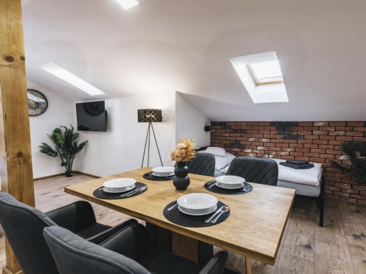 "Historic Centre", 1-room apartment 52 m2 on 3rd floor. Entrance hall. Living/sleeping room with sloping ceilings with 2 beds, 1 double bed, dining table and TV (flat screen), air conditioning. Kitchenette (oven, dishwasher, 4 ceramic glass hob hotplates, kettle, microwave). Shower/WC.