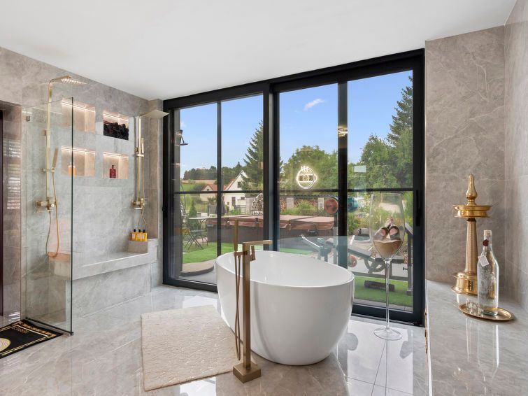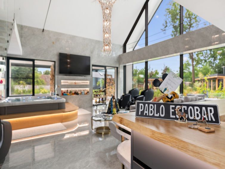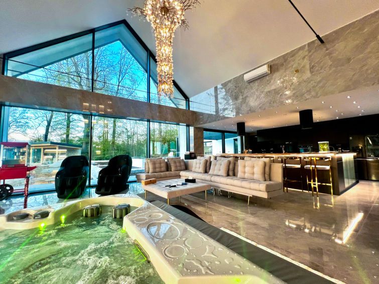 "Ayurvedic Palace", 7-room house 250 m2 on 2 levels. Modern and luxurious furnishings: large living room with hydro massage bath and TV. 1 room with 1 double bed, shower/WC and TV. Walk-through room with shower/WC. 1 room with 1 double bed and TV. Exit to the terrace. 1 room with 1 double bed and TV.