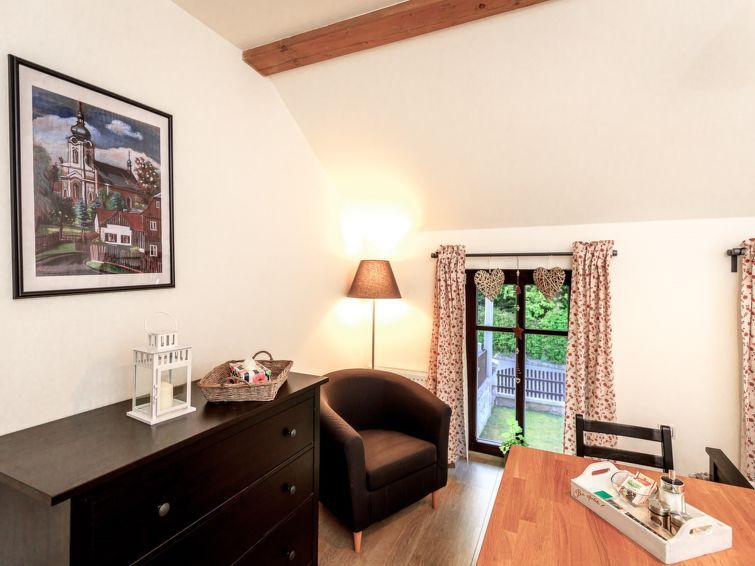 "Arnoltice 10", 1-room apartment on the ground floor. Entrance hall. Living/sleeping room with 1 double bed and satellite TV. Kitchenette (2 ceramic glass hob hotplates, toaster, kettle, microwave) with dining table. Shower/WC. Facilities: Internet (WiFi, free). Please note: suitable for families apartment street side.