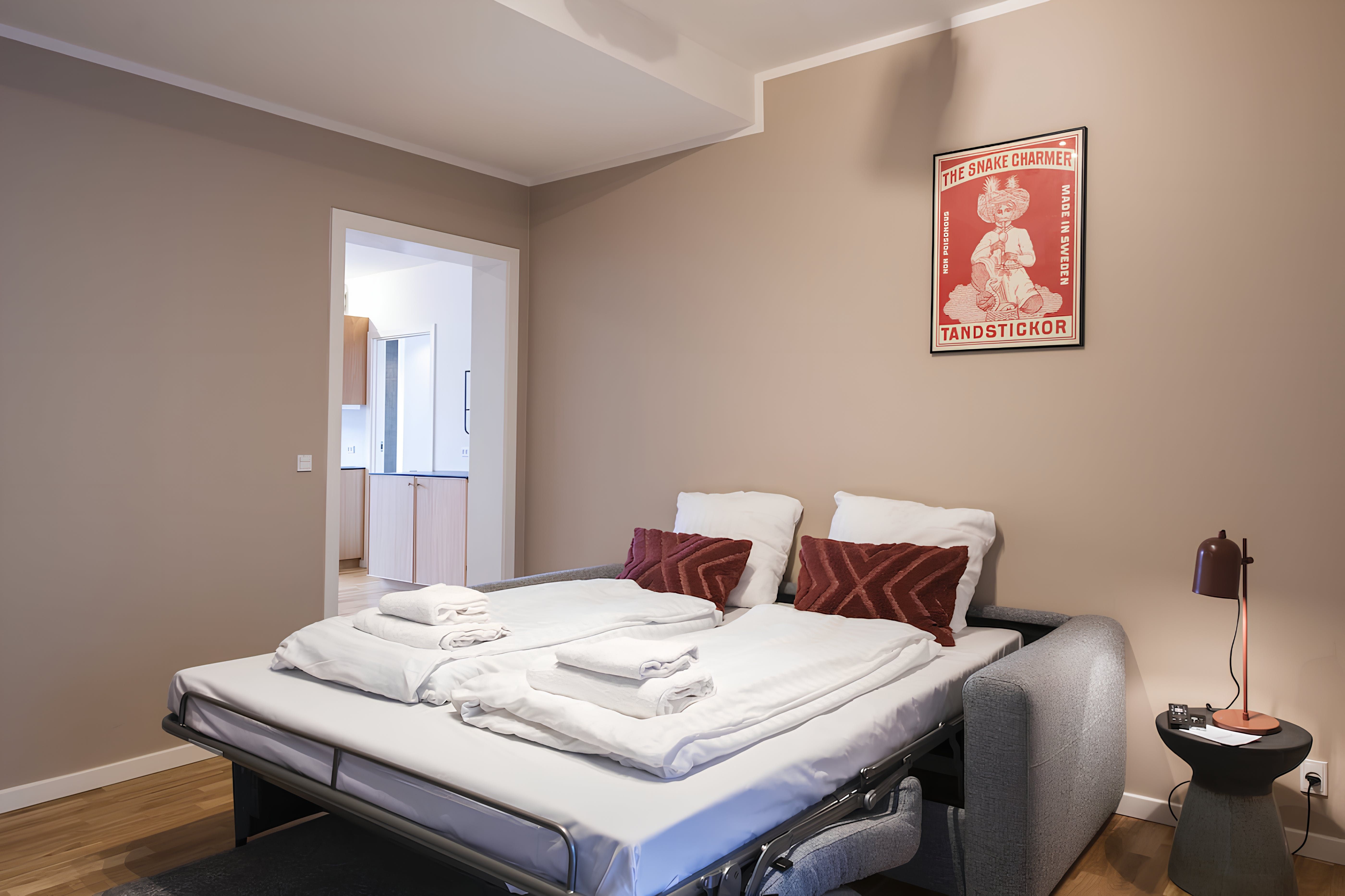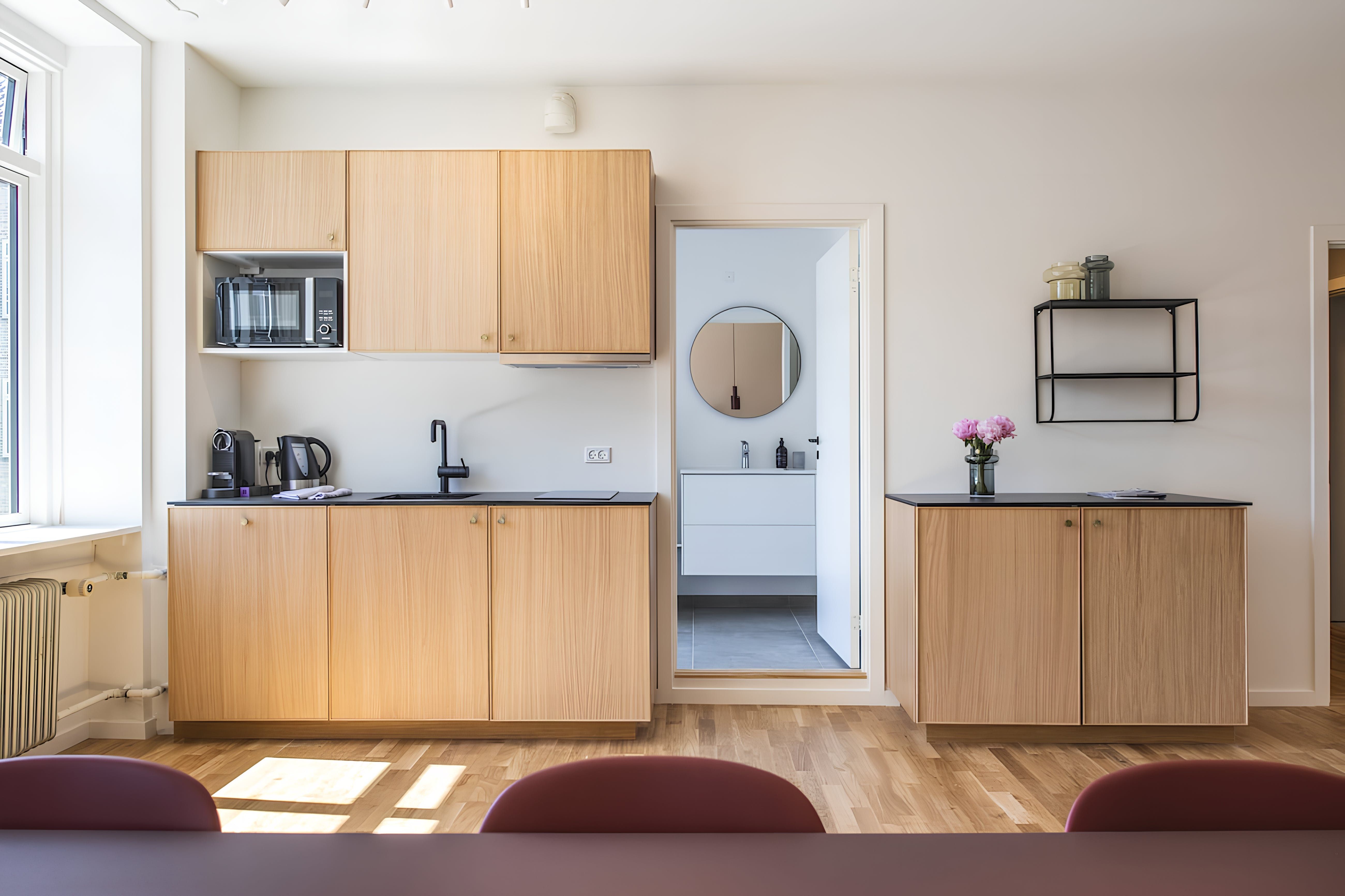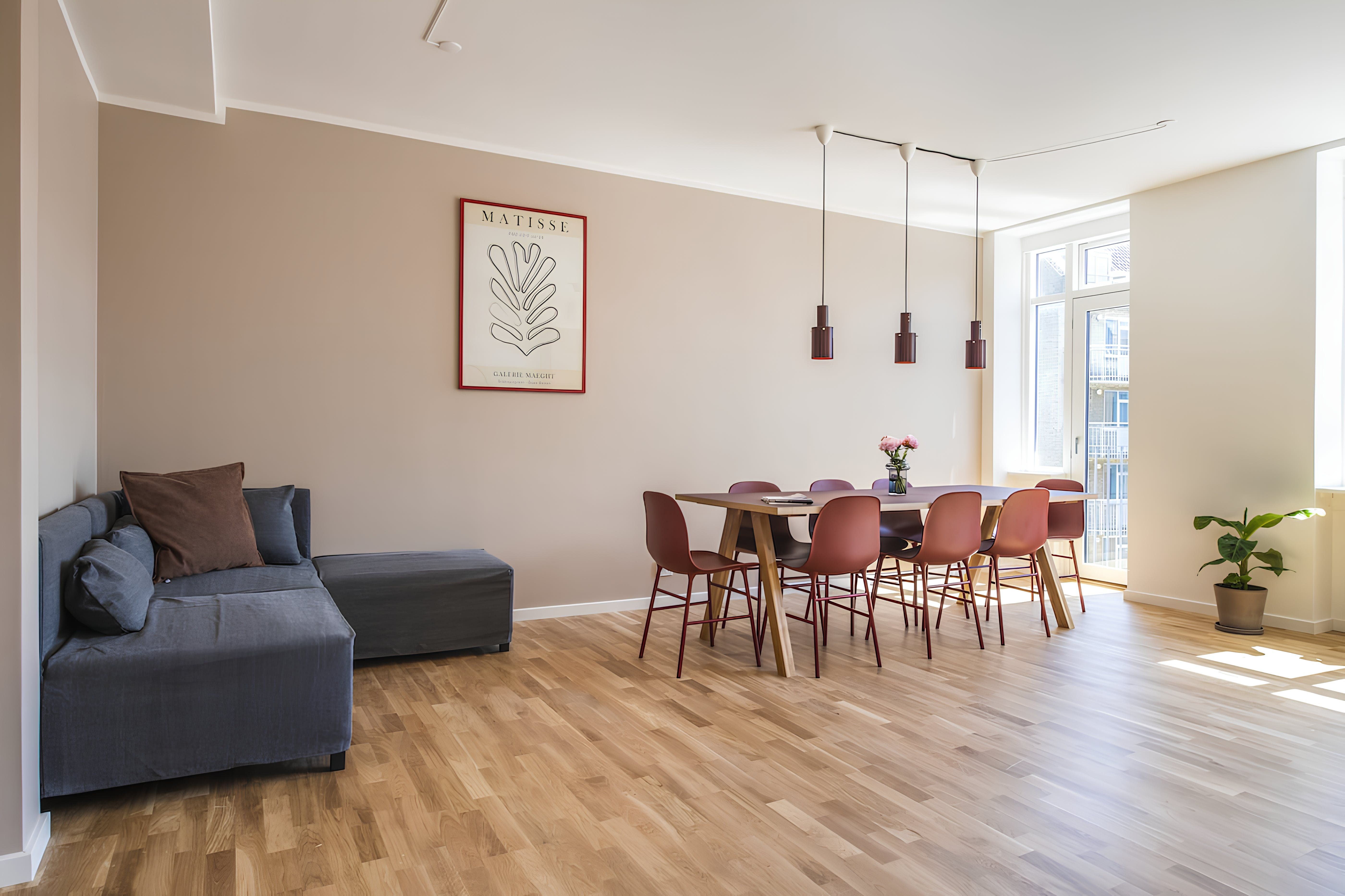 Just a five-minute walk from this apartment will take you to the City Hall Square and the central station. It's the same walking distance to Tivoli Gardens, a magical theme park with a century-old wooden roller coaster, gardens and restaurants. As with the rides at Tivoli, this apartment has some ups and downs – let's start with the good points. There's a shared garden perfect for beers in the summer, and the apartment itself is spacious. To enter the second bedroom, though, you will need to go through the third bedroom. This room doesn't have any windows but borrows light via French doors into the adjacent room, so privacy is also an issue – it’s probably fine for the kids, we would say.