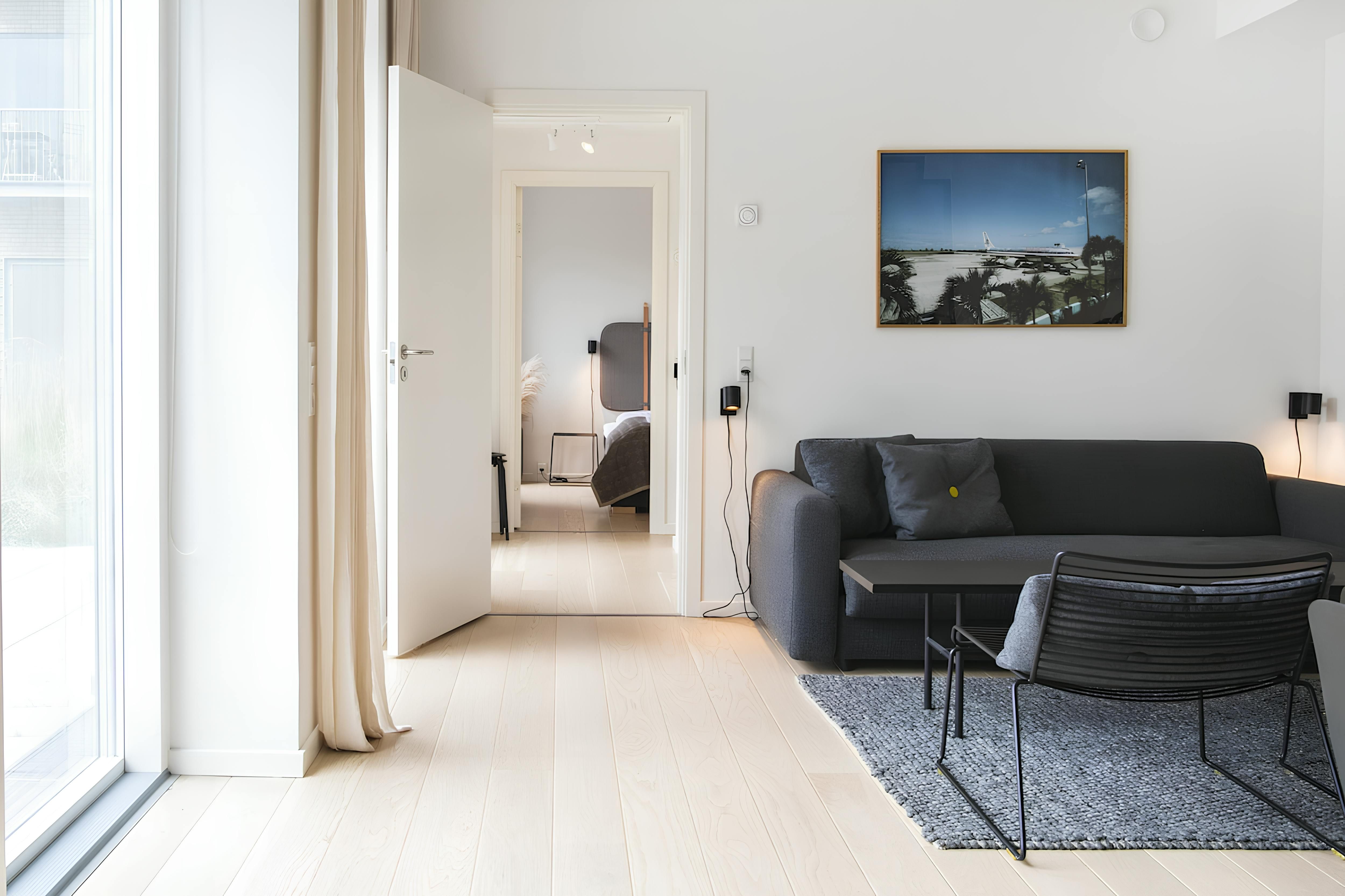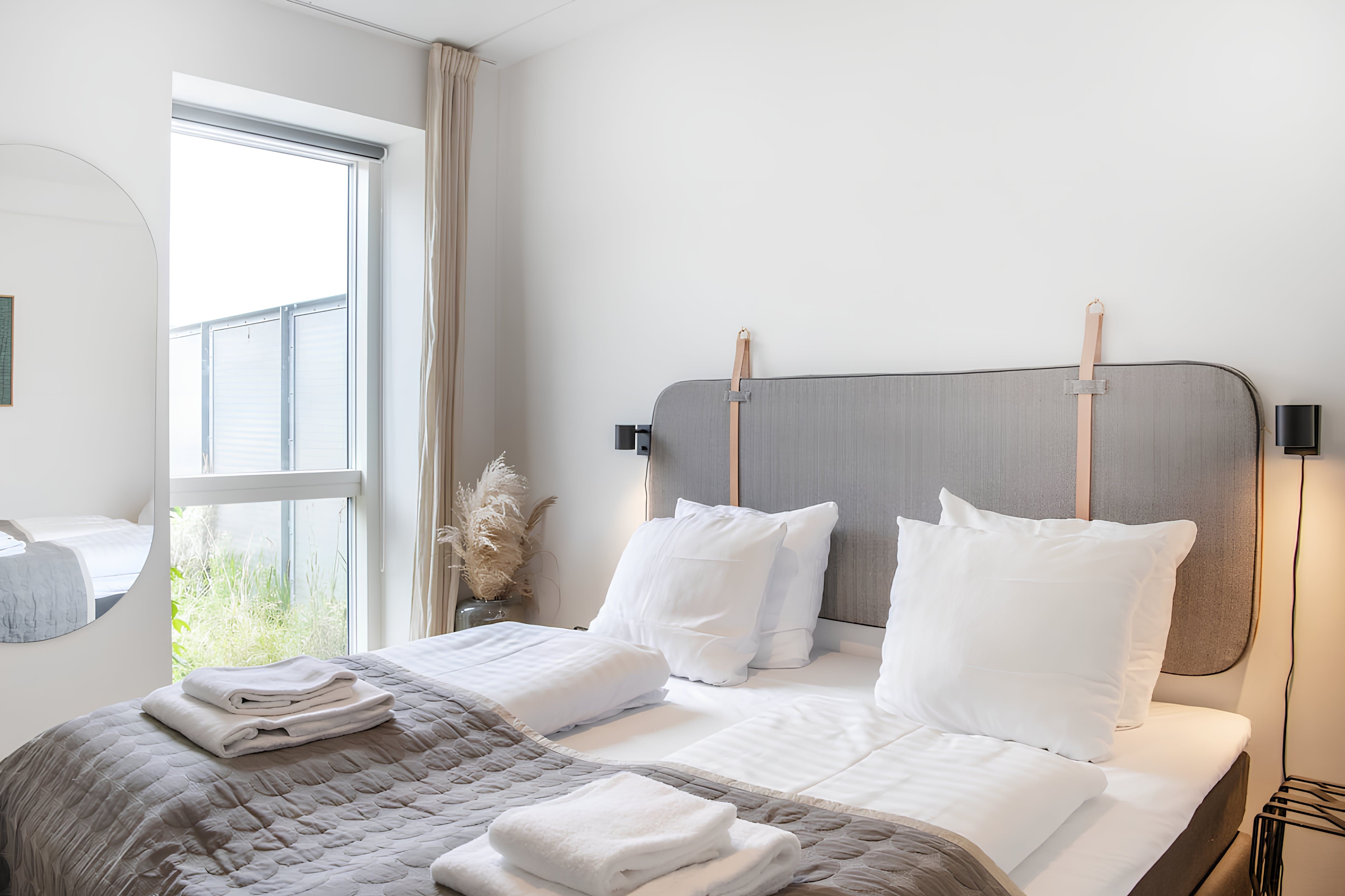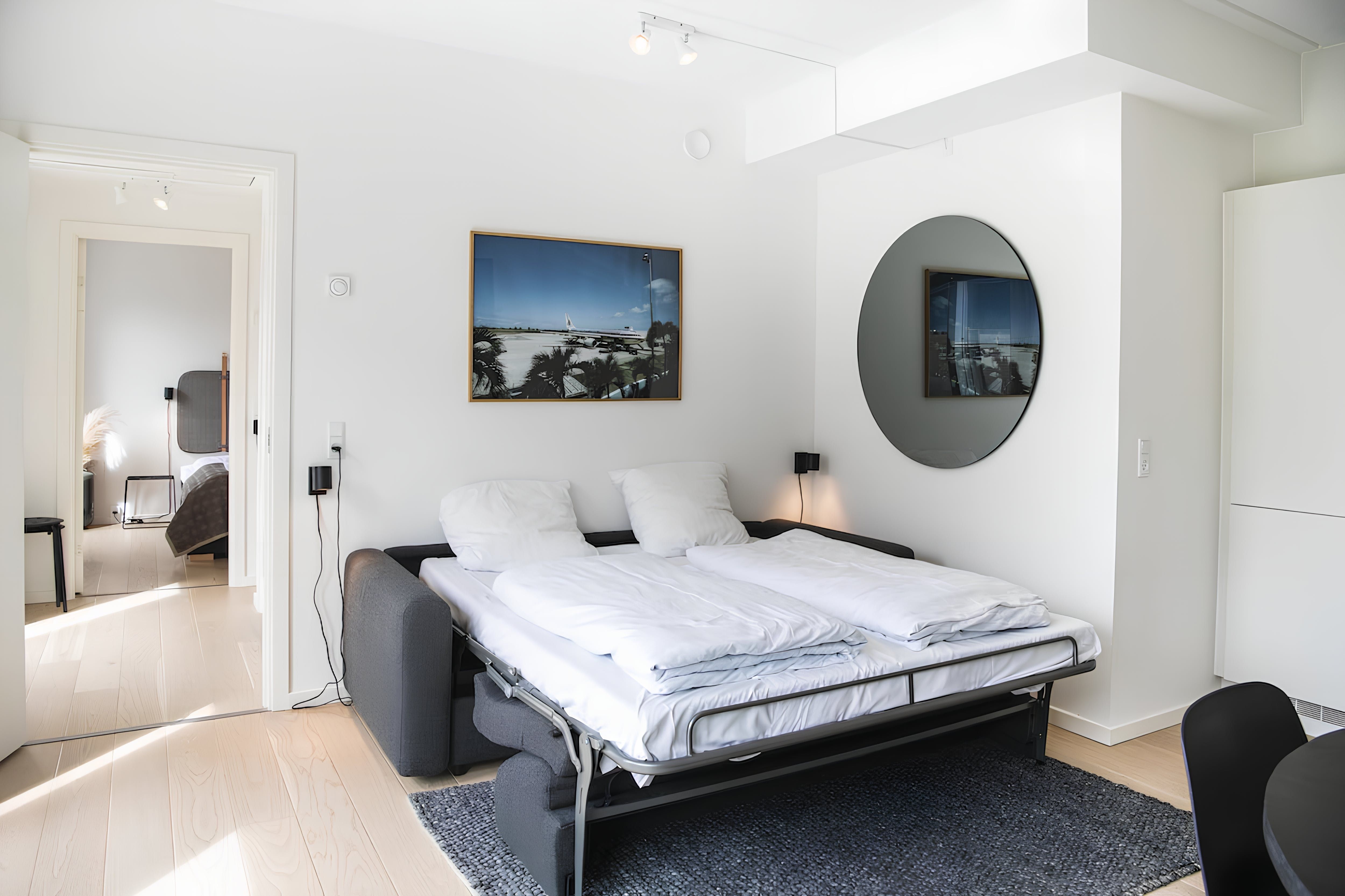Nature and beach lovers will no doubt adore this home's location. The beachfront Amager Strand is nearby, yet Copenhagen's city centre is just three stops on the Metro to Kongens Nytorv. The airport is a ten-minute drive, too, so this place is ideal for a weekend break or business trip. Back at this apartment, enjoy the panoramic views of the azure waters from the private terrace or unwind in the living space. At full capacity, two people will be on a sofa bed in the living area adjacent to one of the bedrooms, which, although it has a frosted glass partition, is not very private.