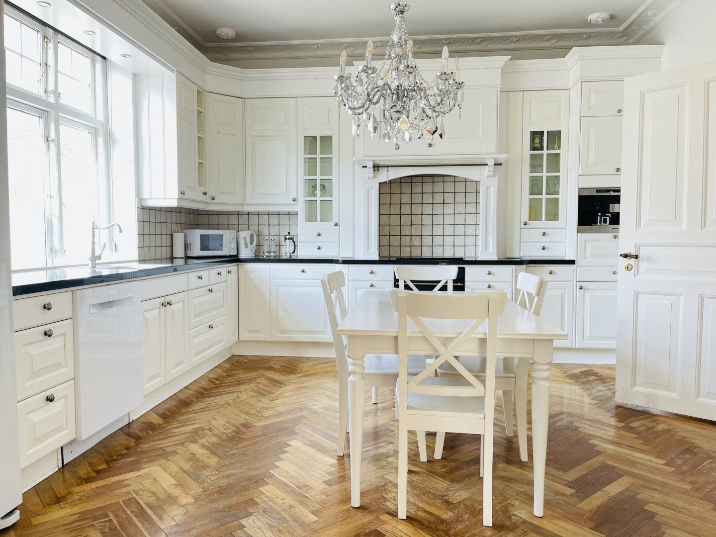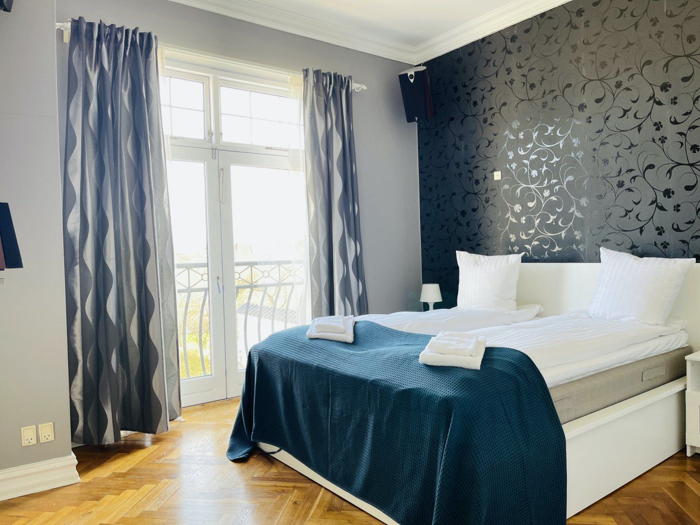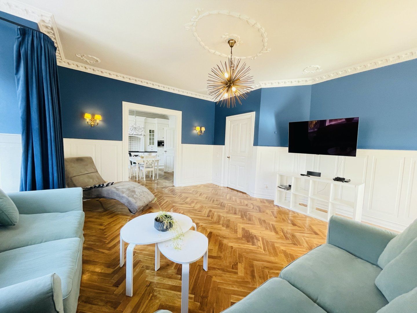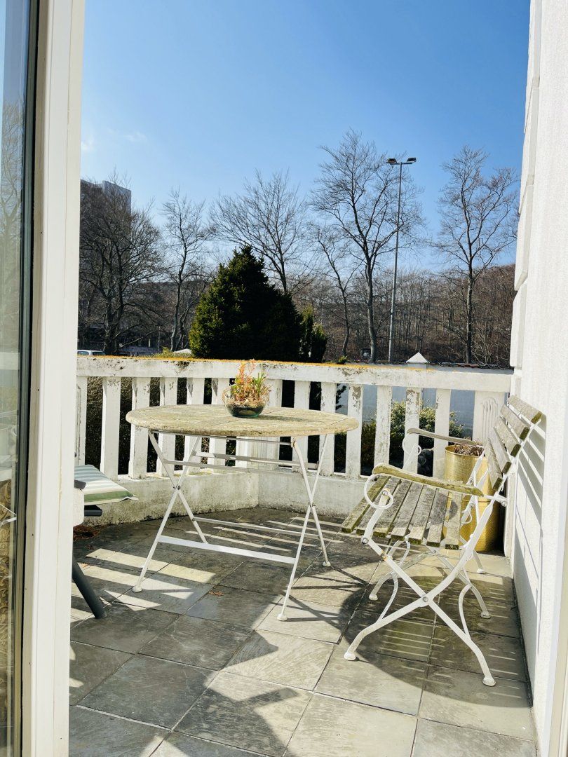 This brightly lit home is located in a convenient spot in Aalborg. The royal blue hues throughout the living room and bedroom make the apartment pop, as well as the pearlescent, sleek kitchen fitted with a sparkling chandelier over the dining table. You'll even have your own little terrace that overlooks the surrounding area and trees, paired with a lovely garden for a relaxing hour out in the sun with a coffee. Snuggle up on the sofa with your loved ones as you watch the latest documentary on Netflix or binge a brand new series on HBO. Wake up to the daylight pouring in through the large windows in the bedroom, followed by a relaxing dip in the jacuzzi bath for a refreshing morning soak.