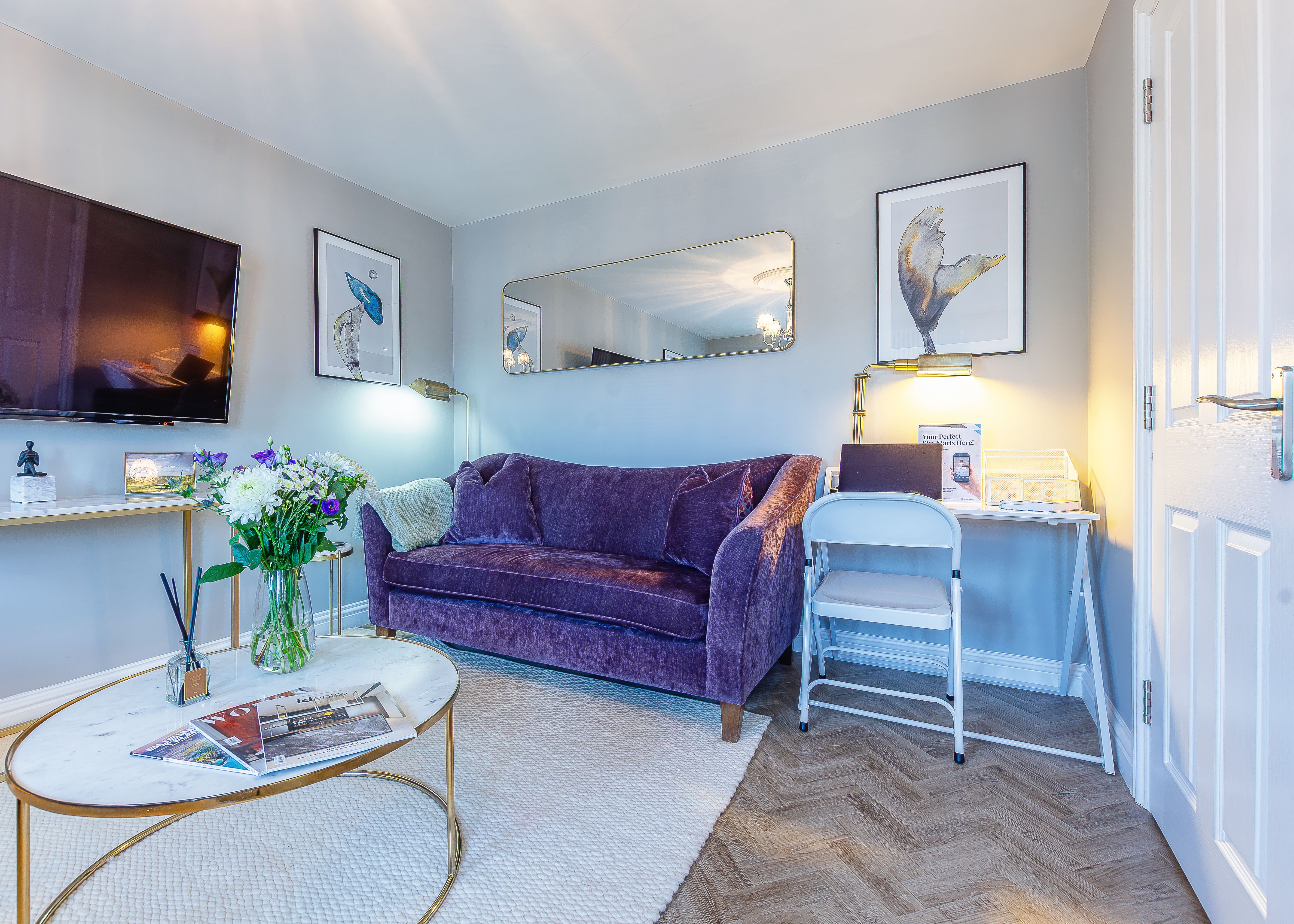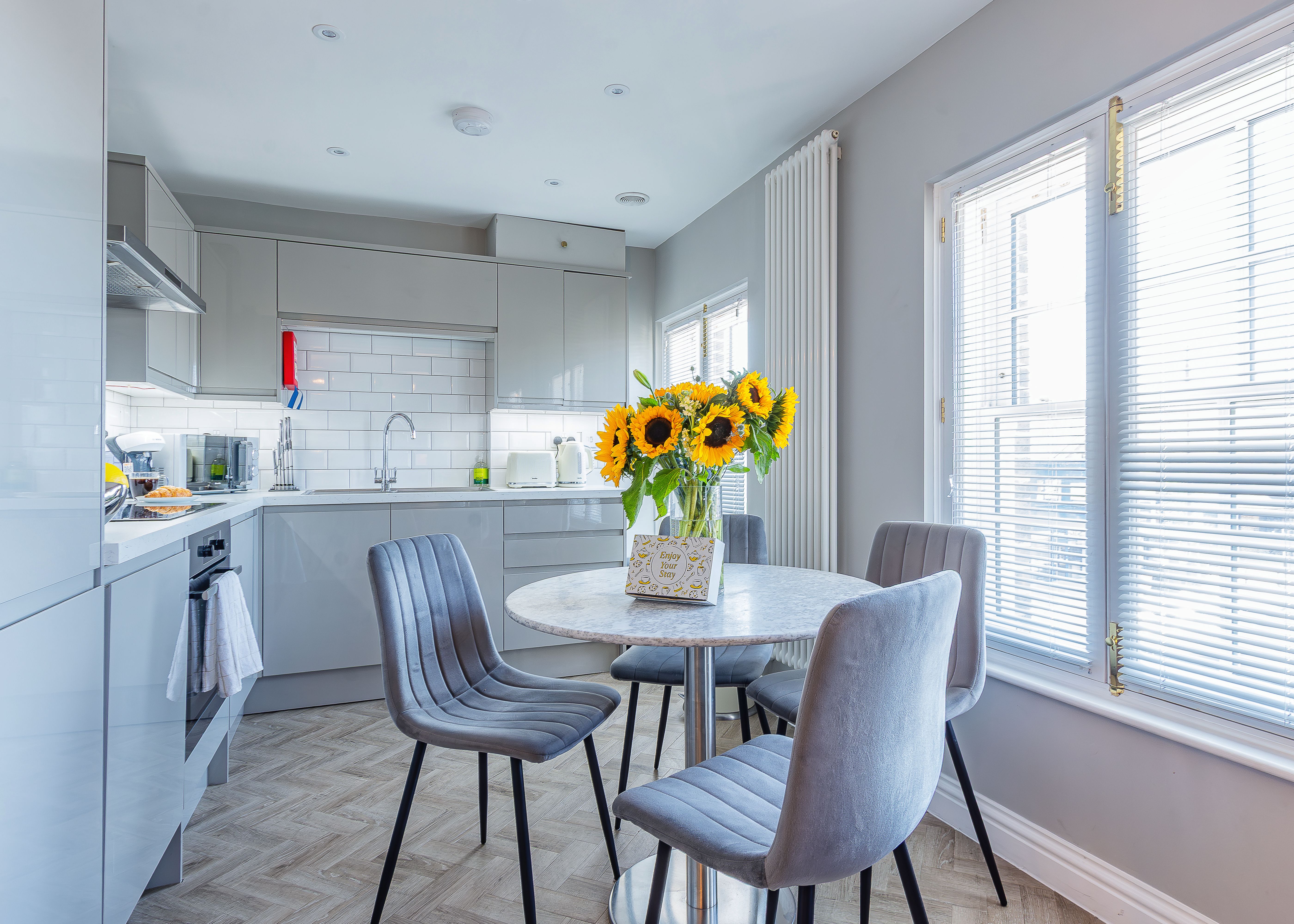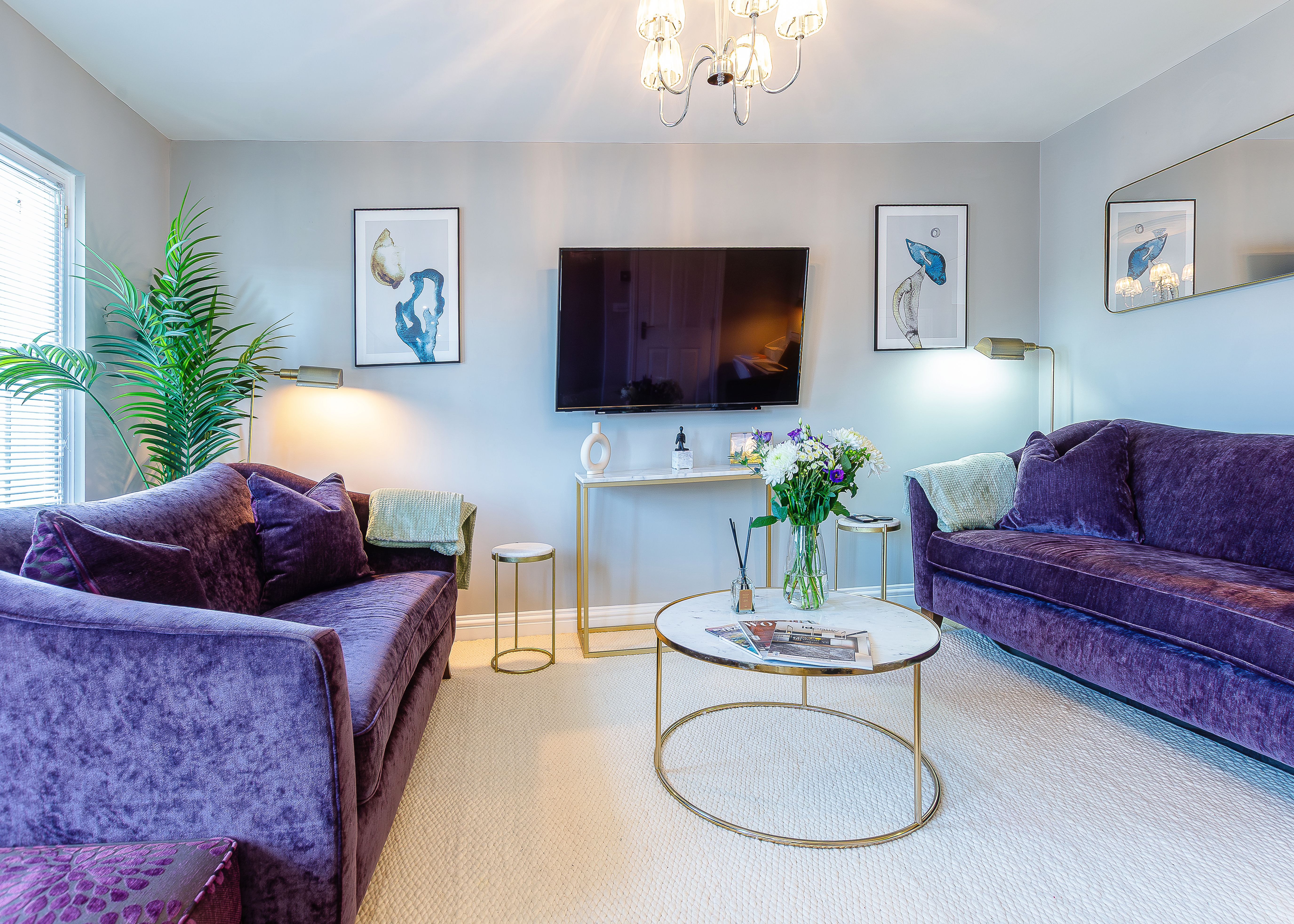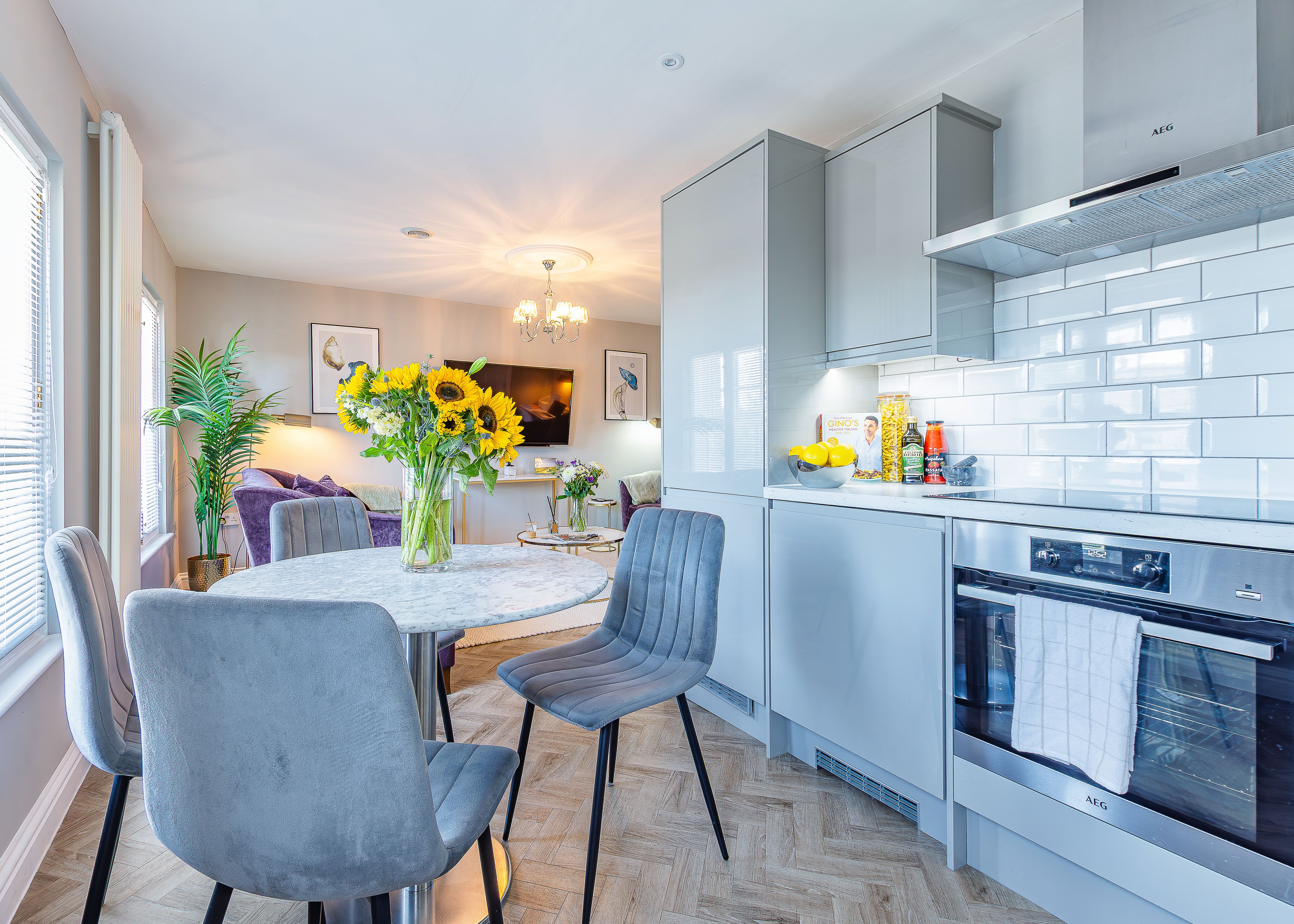 As you look around for the first time, you'll feel instantly at peace, something to do with the soothing greys used throughout. In the living room, a pair of purple sofas, parquet flooring and the chandelier make for a classy space in which to unwind, while the sleek corner kitchen is plenty big enough for cooking up special dinners.