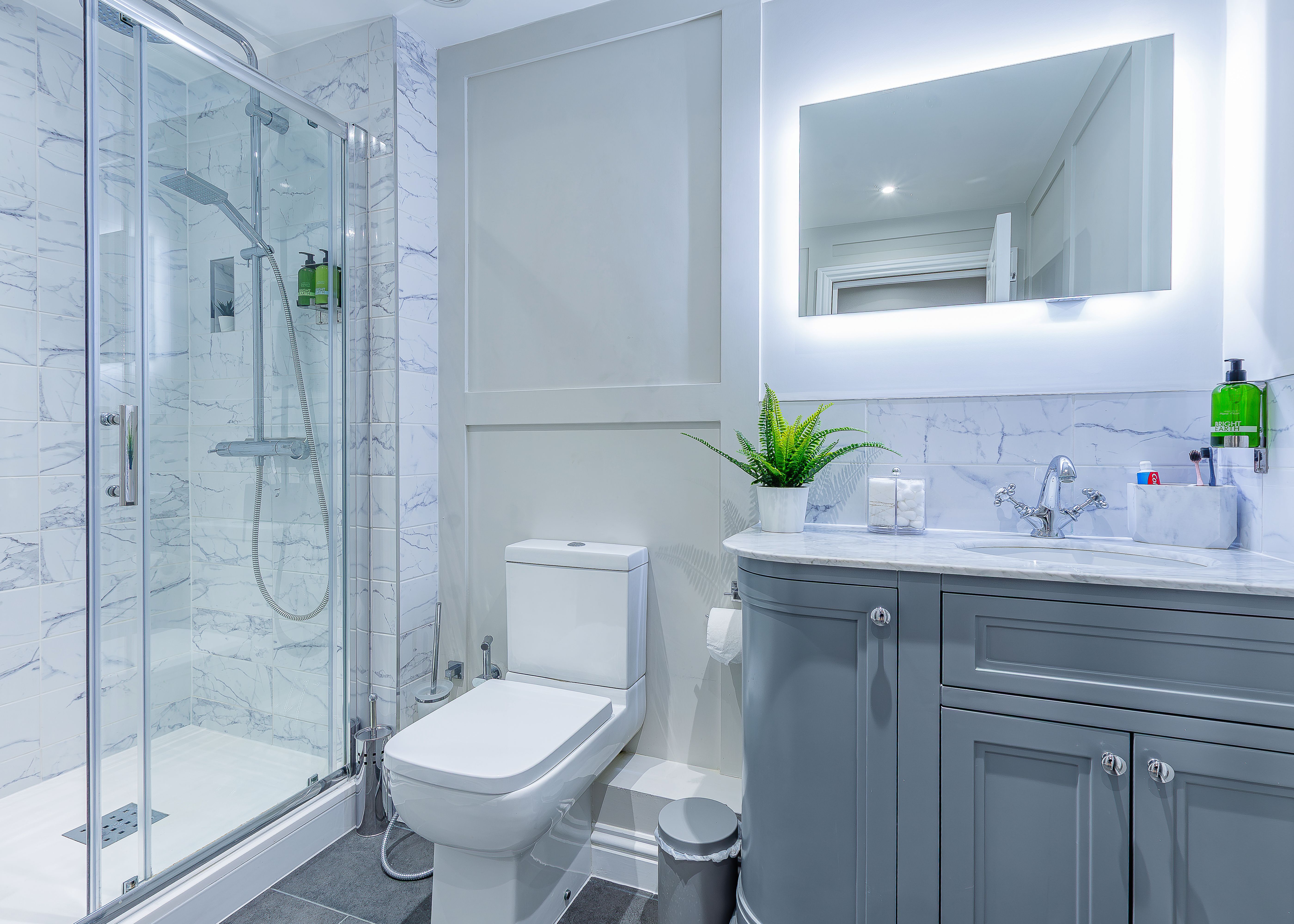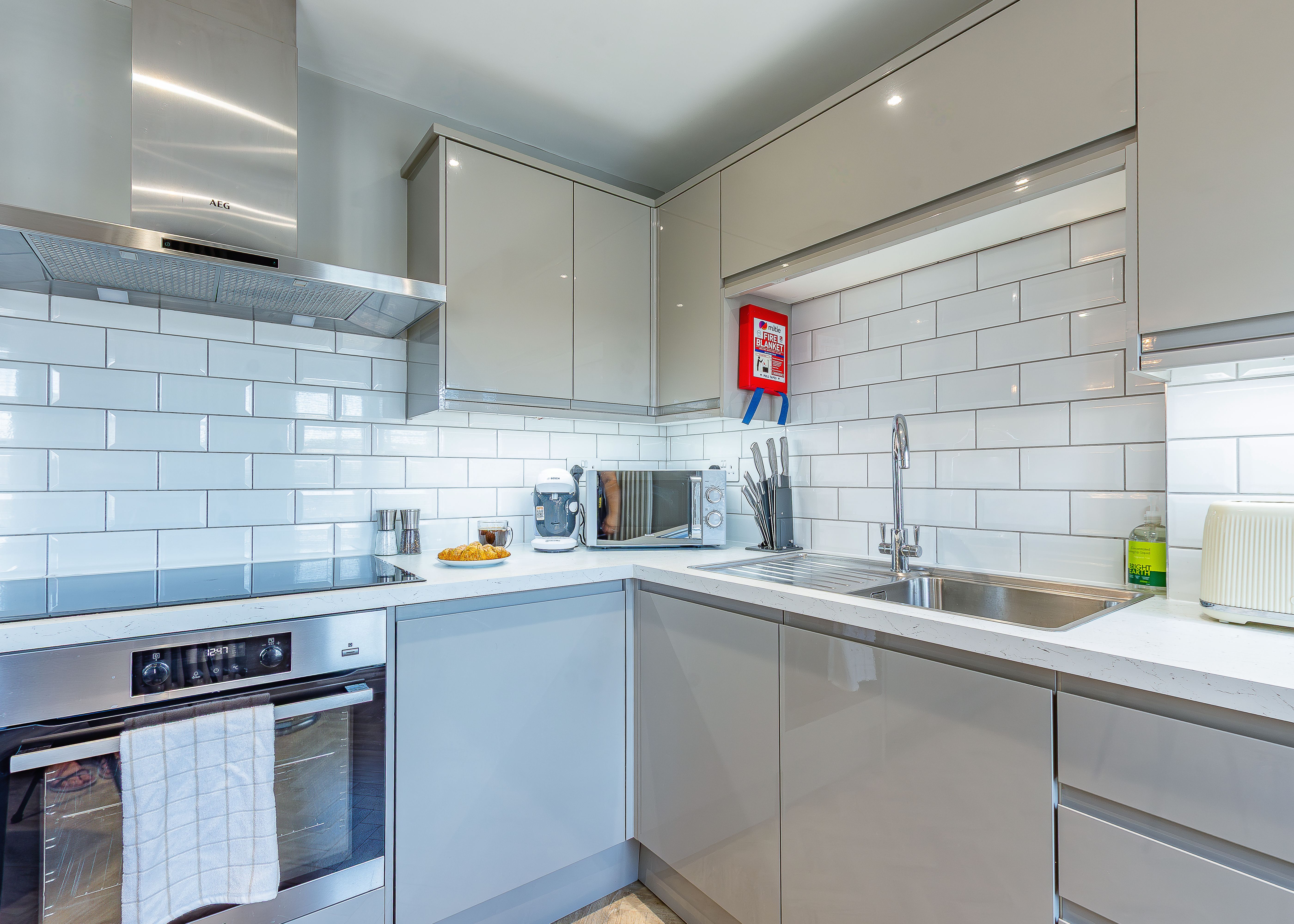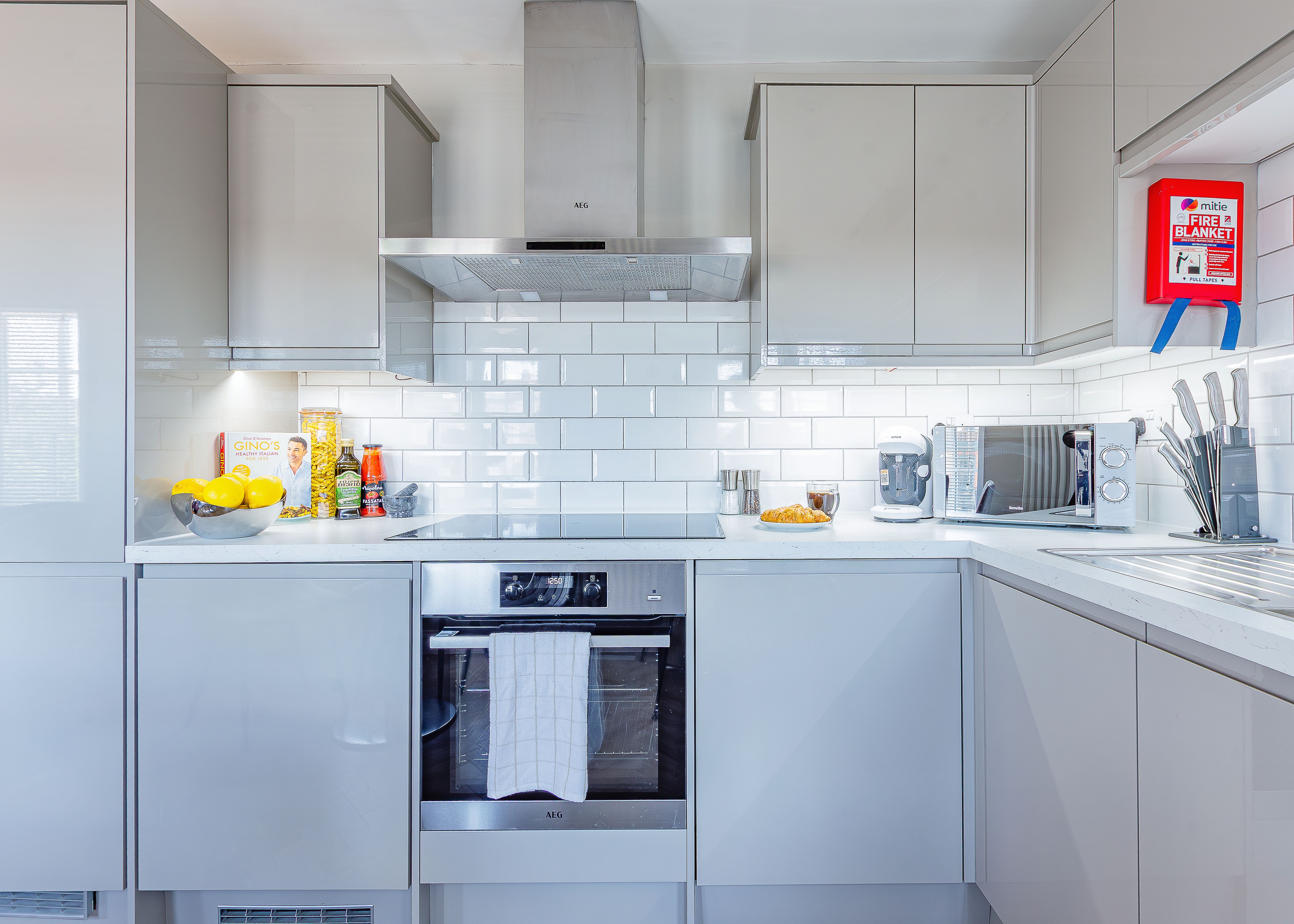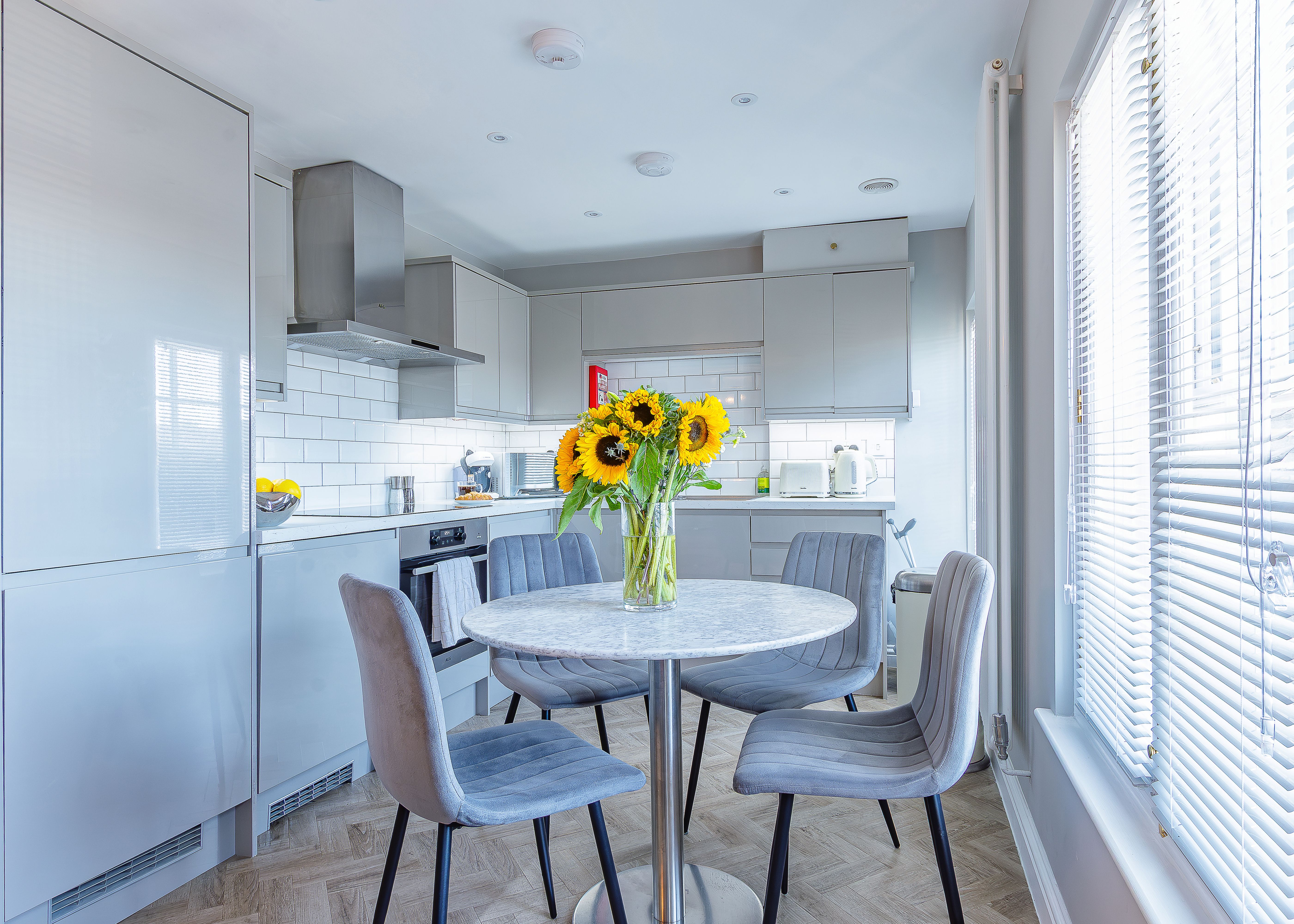 As you look around for the first time, you'll feel instantly at peace, something to do with the soothing greys used throughout. In the living room, a pair of purple sofas, parquet flooring and the chandelier make for a classy space in which to unwind, while the sleek corner kitchen is plenty big enough for cooking up special dinners.