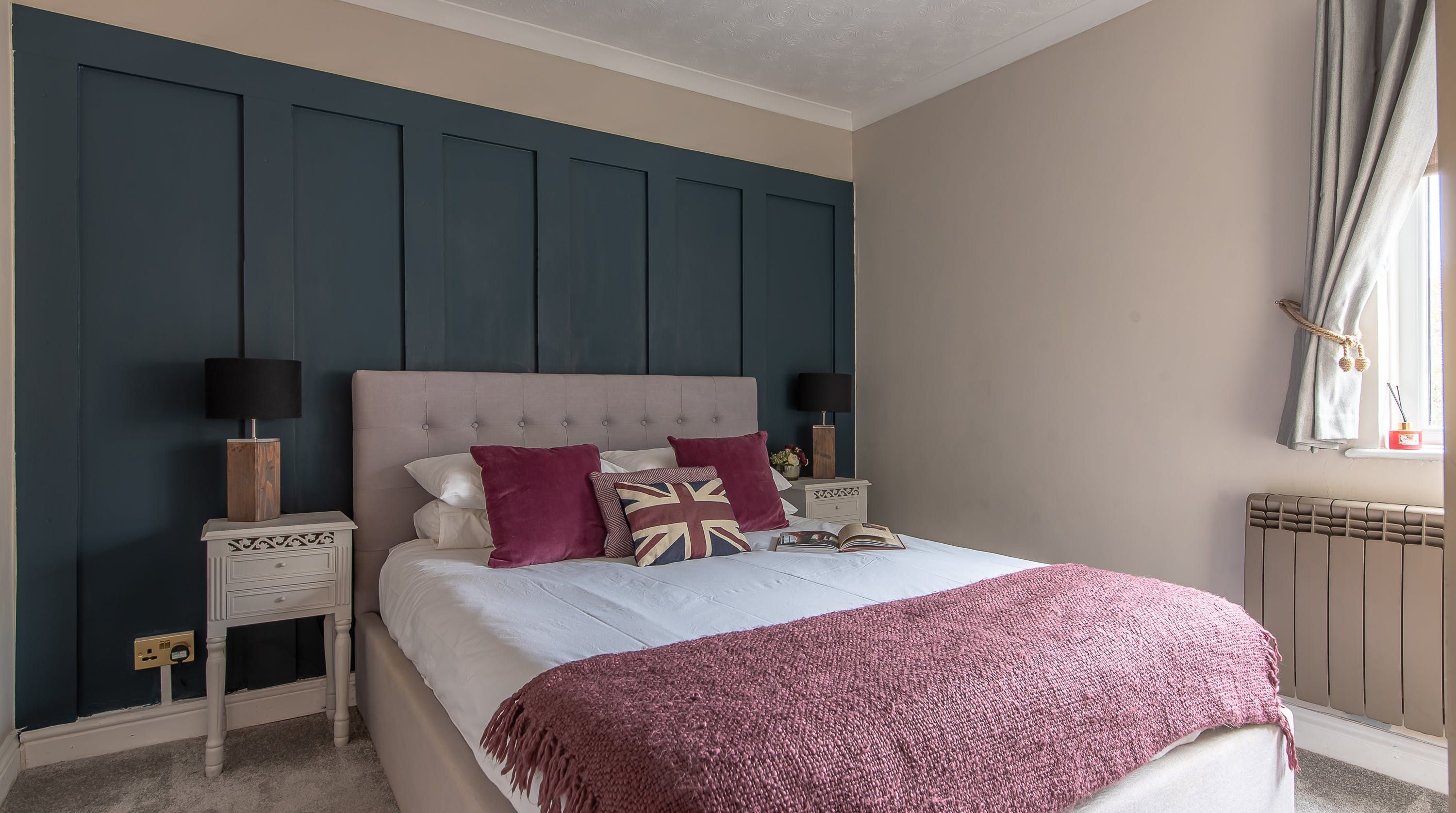 Laid out over three floors, you’ll find plenty of space to socialise as well as opportunities to steal yourself await for some relaxing privacy. We love the woodland palette of the living area with its jewel-toned accents – the ideal spot to kick back, whether on the plump sofa with a glass of wine or around the farmhouse-style dining table for a celebratory home-cooked meal. Upstairs, the three bedrooms each boast their own singular decor, from the claret and blue Britannia-themed one to the nature-inspired single bedroom and the stunning main bedroom with its large slanted window. Factor in the bathroom’s luxurious rainfall shower and you’ve got everything you need for a perfectly blissful stay.