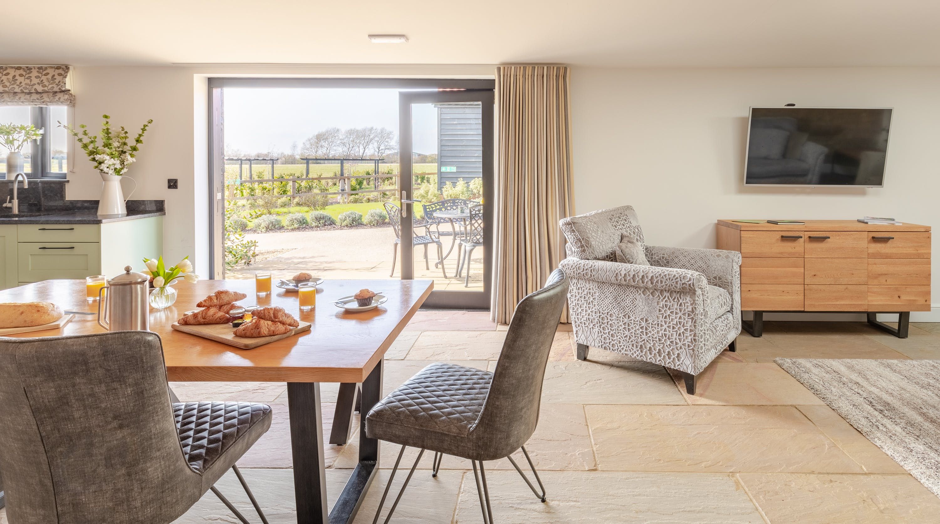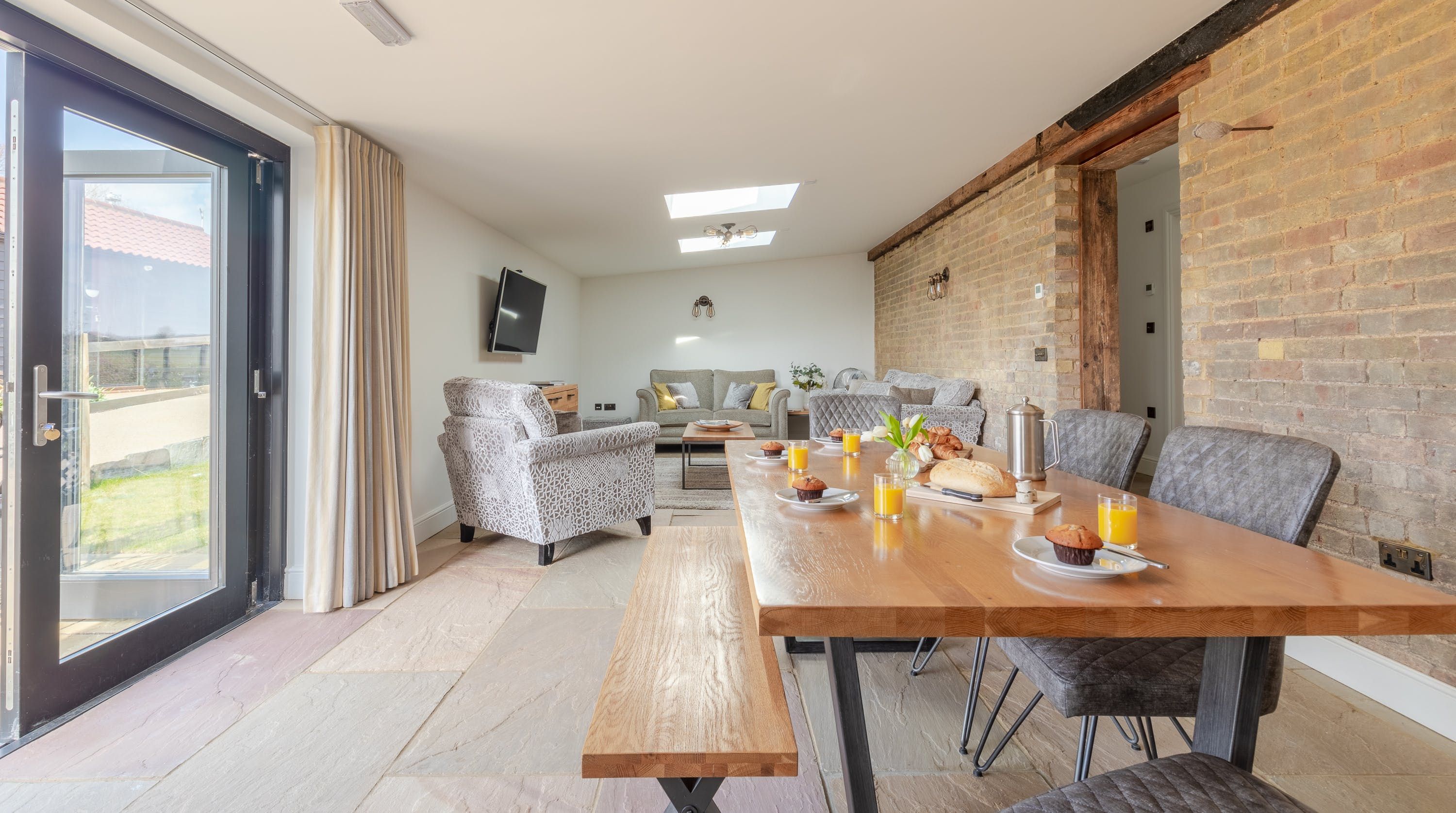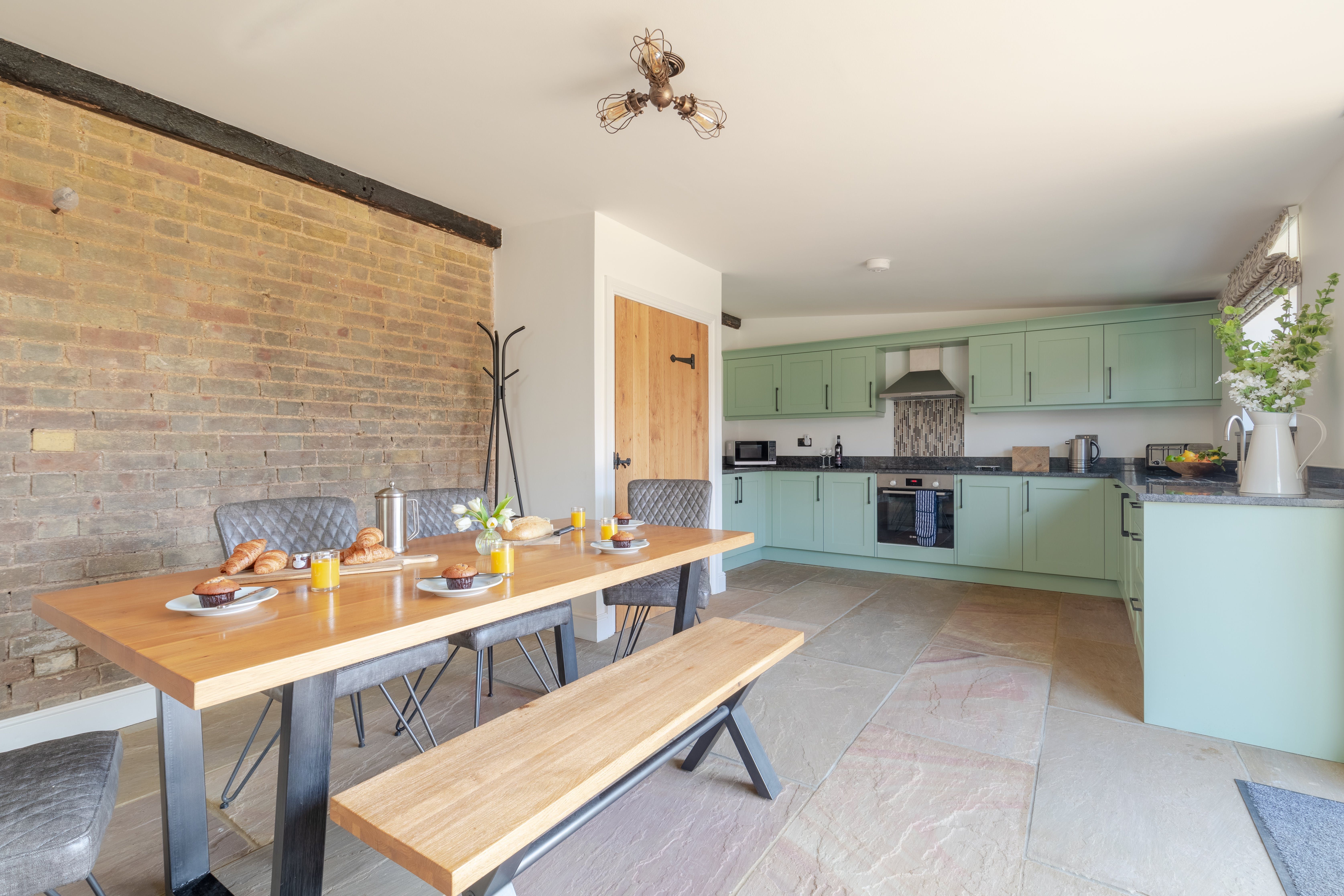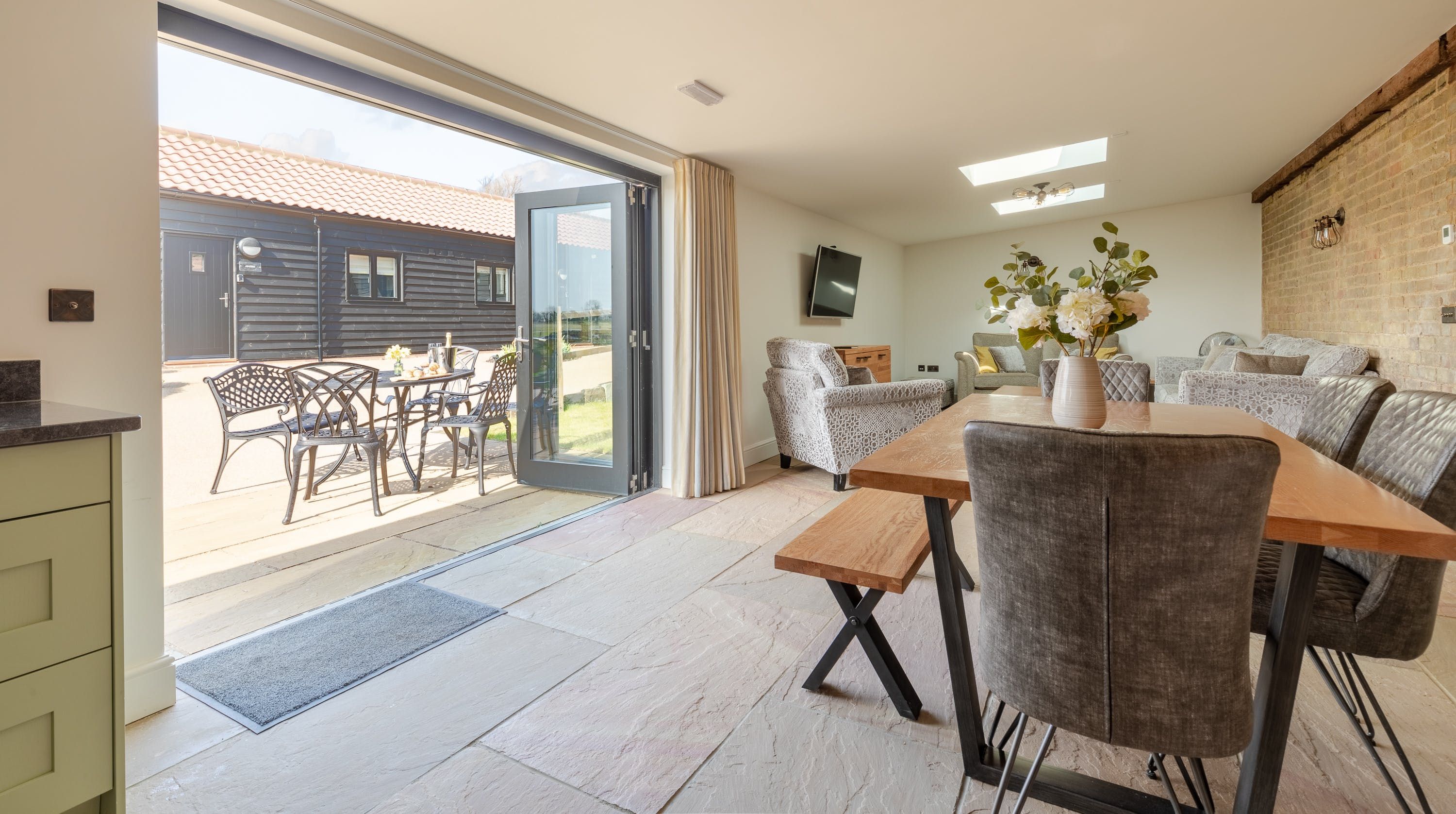 An open-plan layout presents a sociable kitchen area equipped with solid hardwood and quartz worktops, that extends over to a snug living area where guests can relax and unwind after days spend exploring Cambridgeshire. Open up the bi-fold doors onto the private terrace area to take in the luscious green views over the surrounding farmland. Here, there's no better place to tuck into homemade meals than the patio dining area on sunny days.