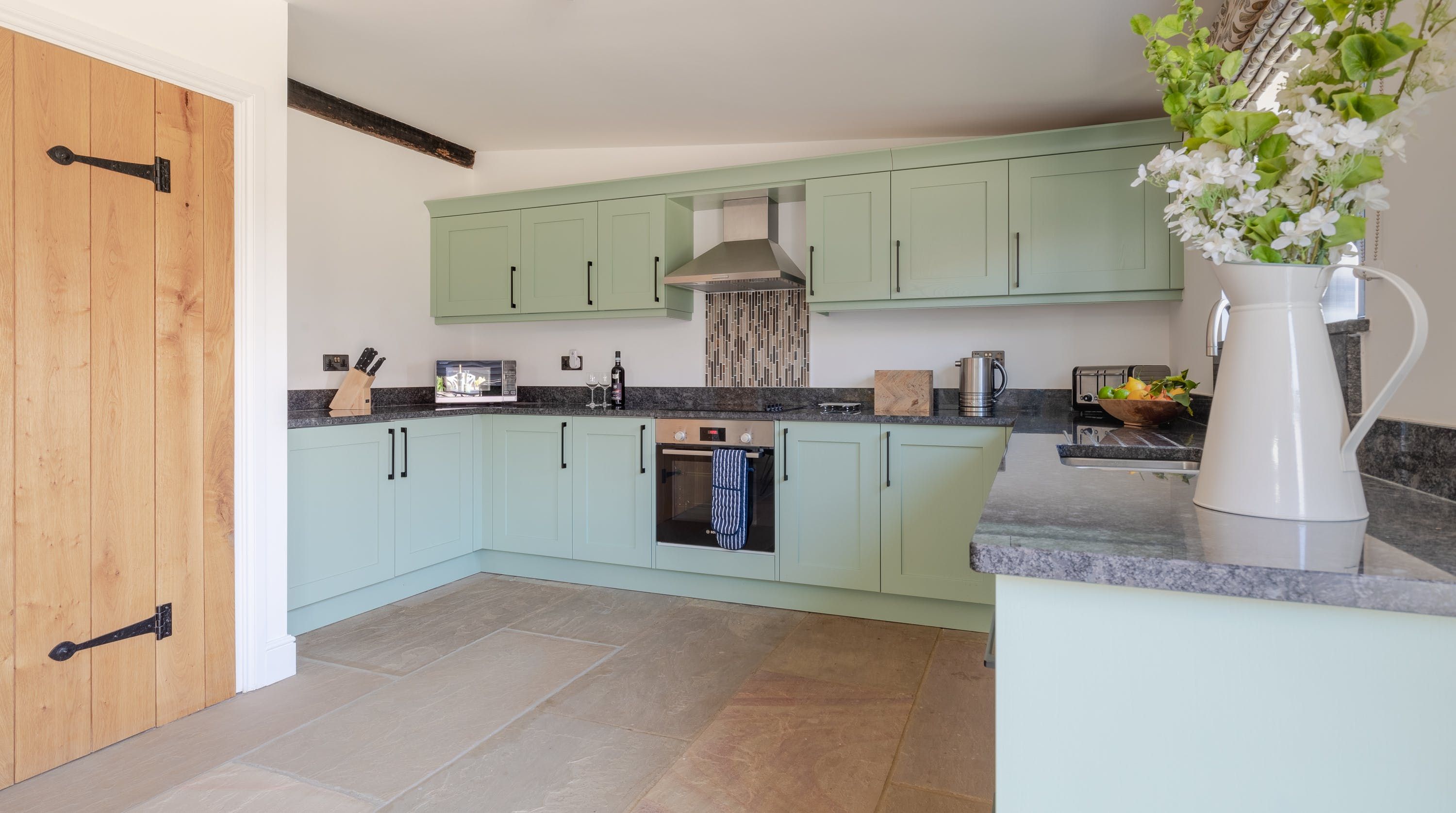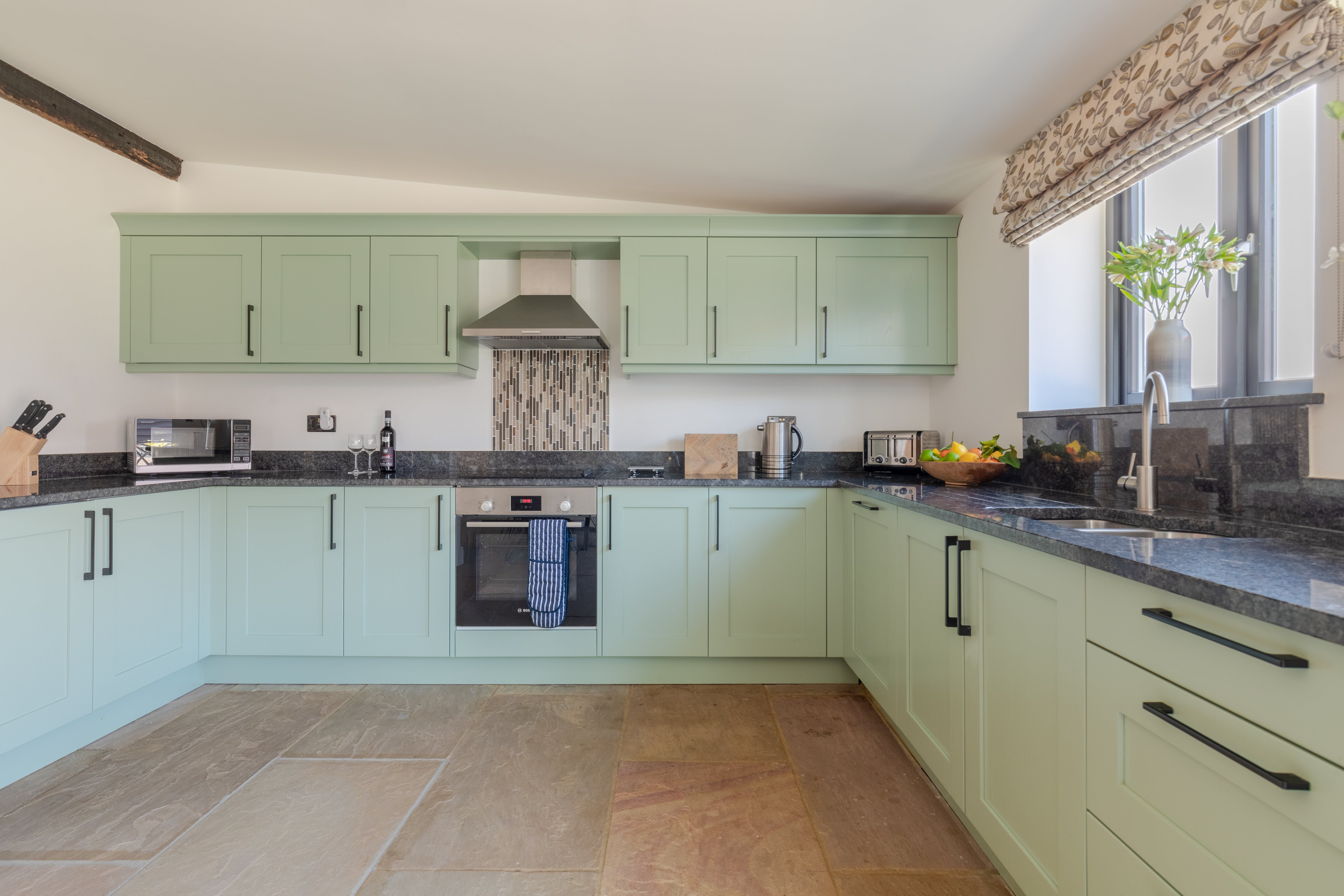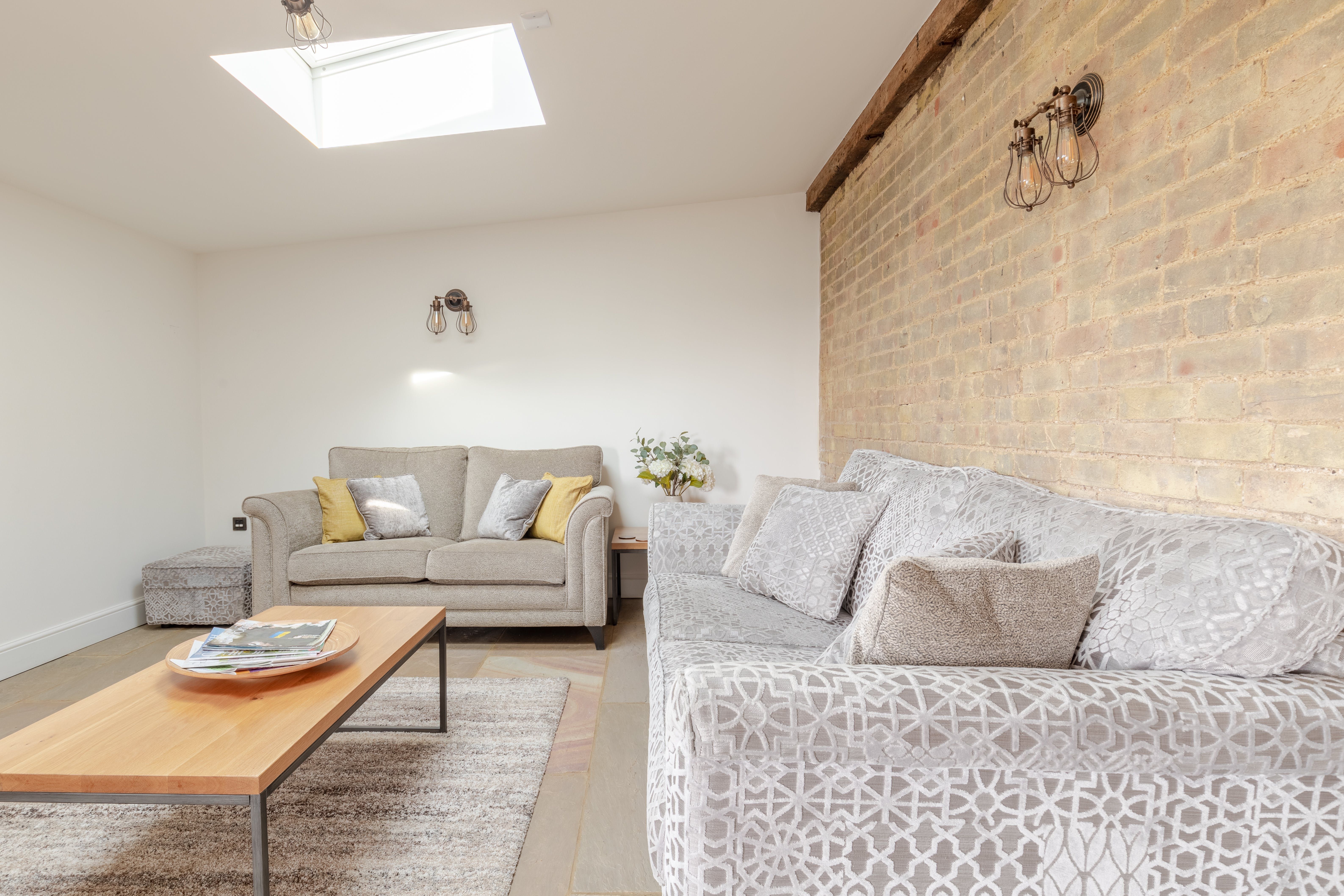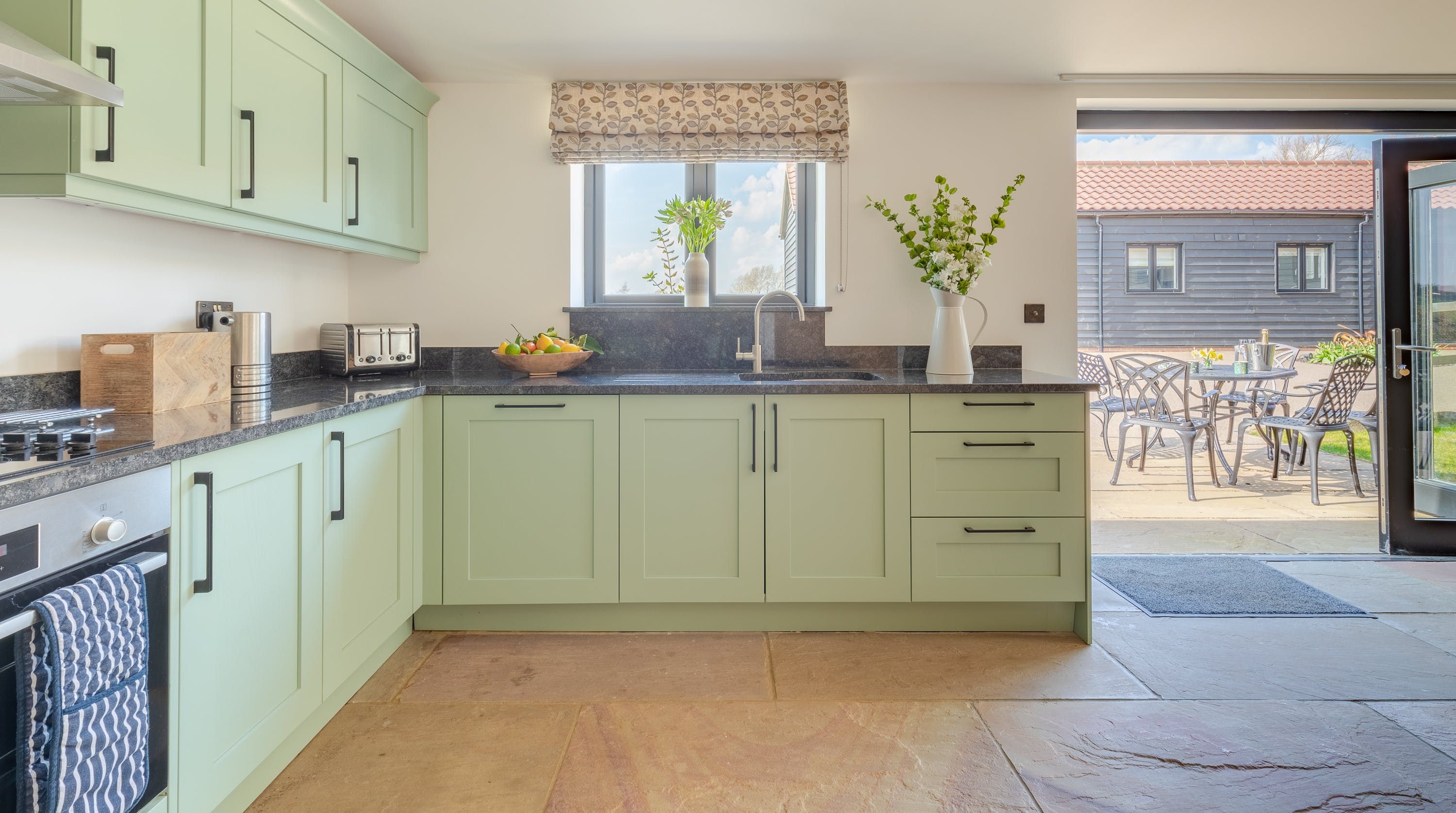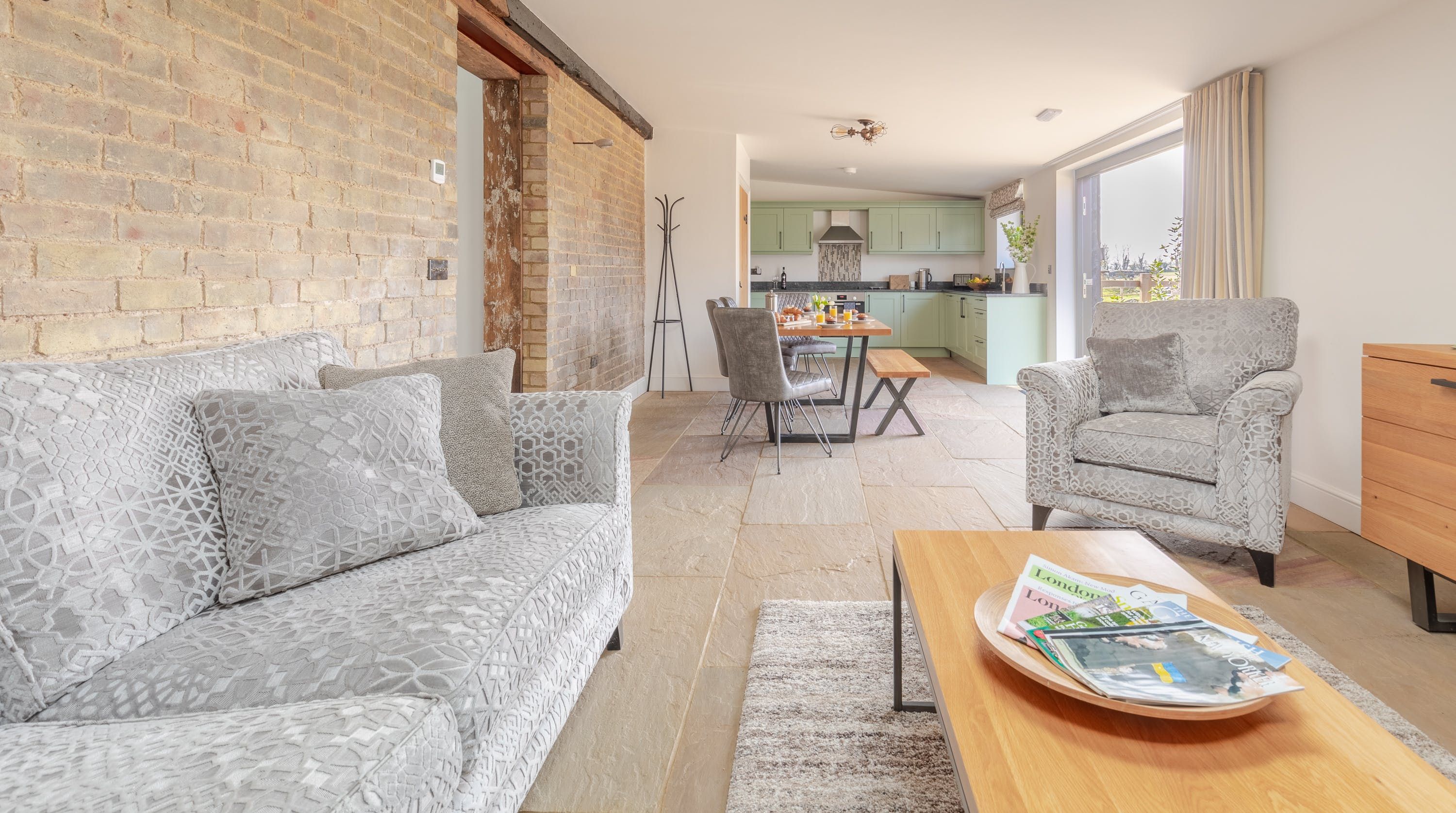 An open-plan layout presents a sociable kitchen area equipped with solid hardwood and quartz worktops, that extends over to a snug living area where guests can relax and unwind after days spend exploring Cambridgeshire. Open up the bi-fold doors onto the private terrace area to take in the luscious green views over the surrounding farmland. Here, there's no better place to tuck into homemade meals than the patio dining area on sunny days.