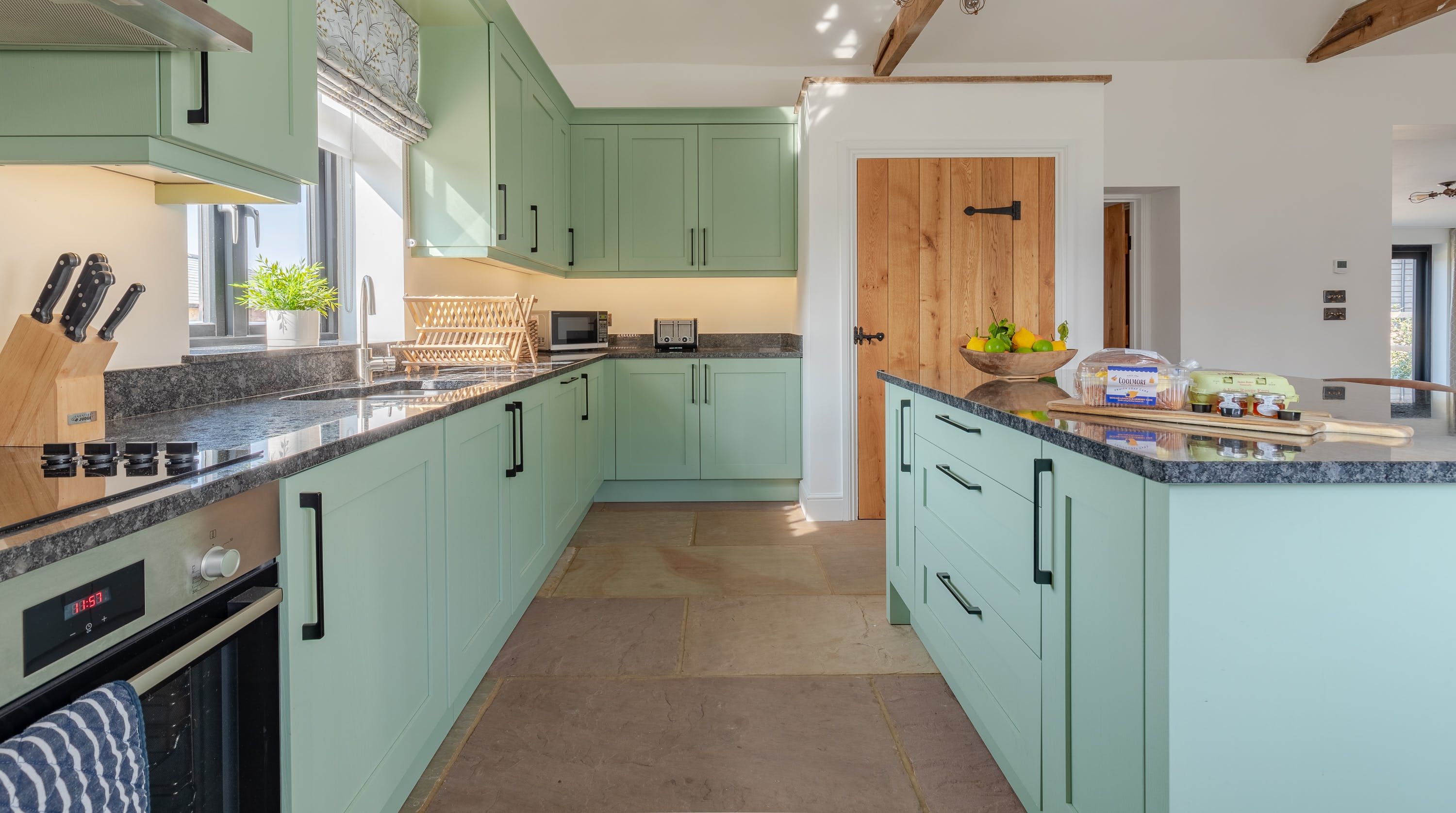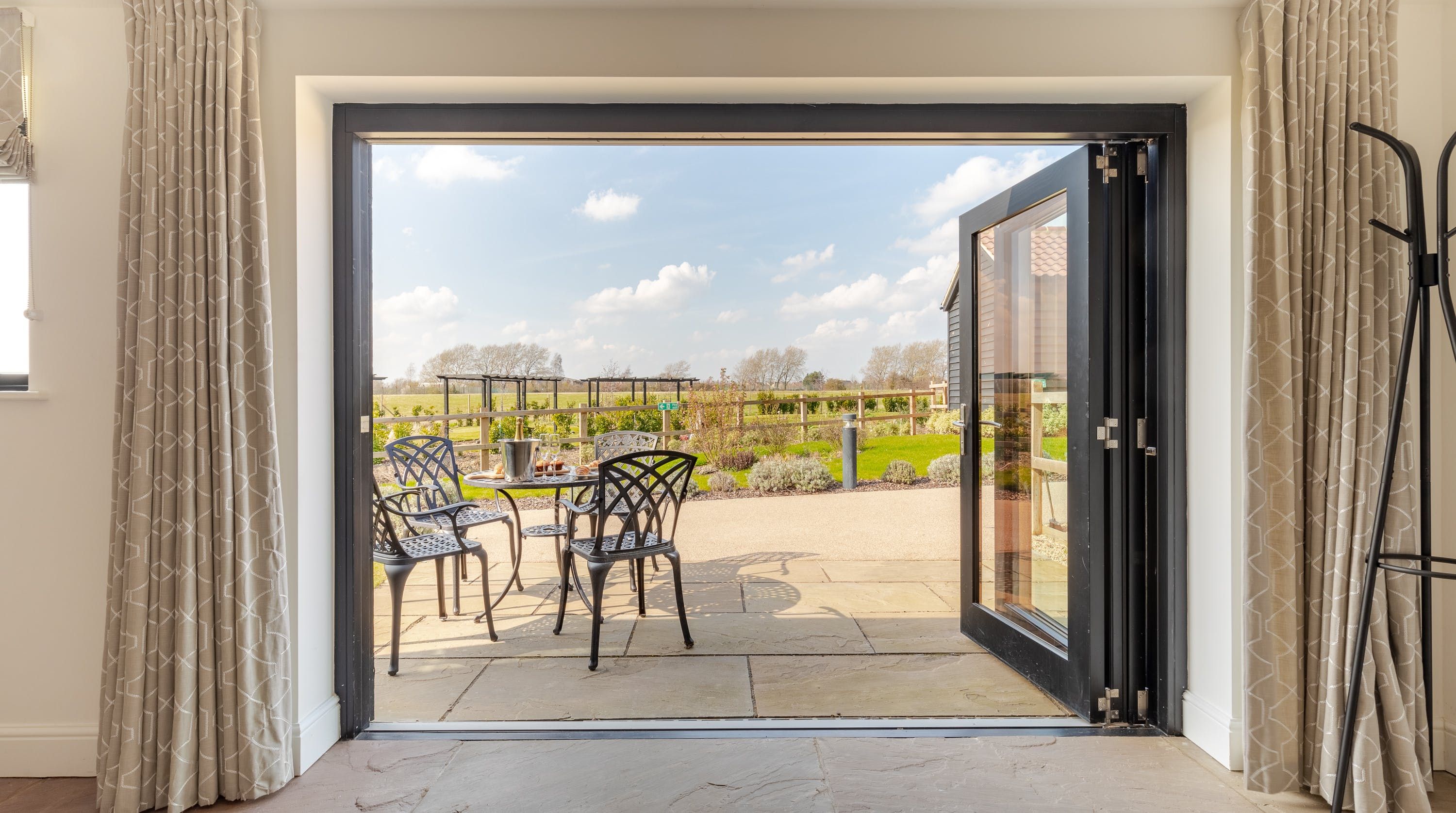 An open-plan layout creates a sociable and stylish kitchen and living room area at the heart of the barn conversion, where bi-fold doors open out onto a private terrace and alfresco dining area. Take in scenic views over the luscious green farmland when eating delicious homemade meals in the fresh air.