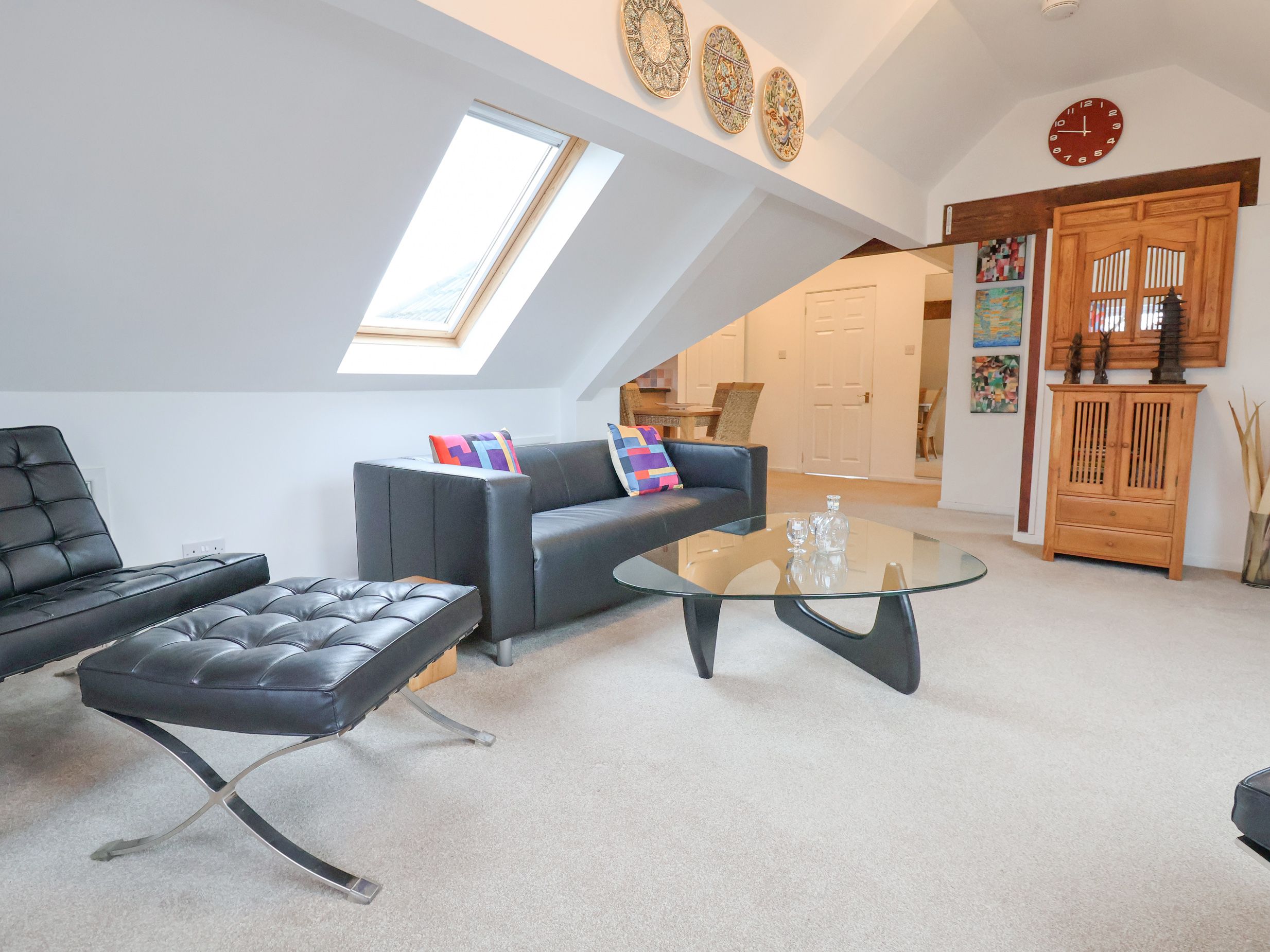 We choose self-catering accommodation for – location, comfort and convenience.. If a place adds style and character that's a nice bonus. The Dragon's Den ticked all the boxes handsomely! It's a very clever (and totally self-contained) loft conversion above the owner Mike's bungalow. The accommodation is spacious, light, airy, and very thoughtfully furnished and equipped. The large living area is welcoming and comfortable, with two big leather sofas plus matching armchair, TV, loads of books, CDs, a classy chess set plus other games, and three drawers full of tourist information. The kitchen is 'compact', but has everything you need for a week (including some good kitchen knives, which are a rarity in holiday lets!) There's a thoughtful supply of kitchen essentials for people like me who manage to forget the teabags. The fridge was stocked with milk and butter, and there was a crusty loaf. Much more useful than the usual little packets of biscuits! The bathroom is a good size, with a bath and separate shower cubicle, and lots of fluffy towels, and some sachets of shampoo in case you have forgotten that as well as the teabags. The two bedrooms have comfy beds and there's plenty of storage space. The décor is cool, clean, stylish, with some very attractive modern oak furniture. It's also quirky, with sloping ceilings (and floor), beams, and a lot of little dragons hiding in the corners. It's near a busy road, but well set back. There's a good bus service from just round the corner into Chester, but Mike's information sheet includes instructions for a very pleasant walking route, along quiet, leafy avenues and lanes. We hadn't visited Chester for twenty five years, it hasn't changed much, still a lovely city. But to see it at its best, avoid Saturday afternoon / evening – unless you appreciate aspiring Footballers' Wives unable to stand up reliably on their heels, let alone walk, and young men with a taste for extreme hairstyling and noisy cars. The rest of the week it's a very civilised place to wander around and soak up the atmosphere! Thanks to Mike for making us feel welcome and at home. We hope to return.
