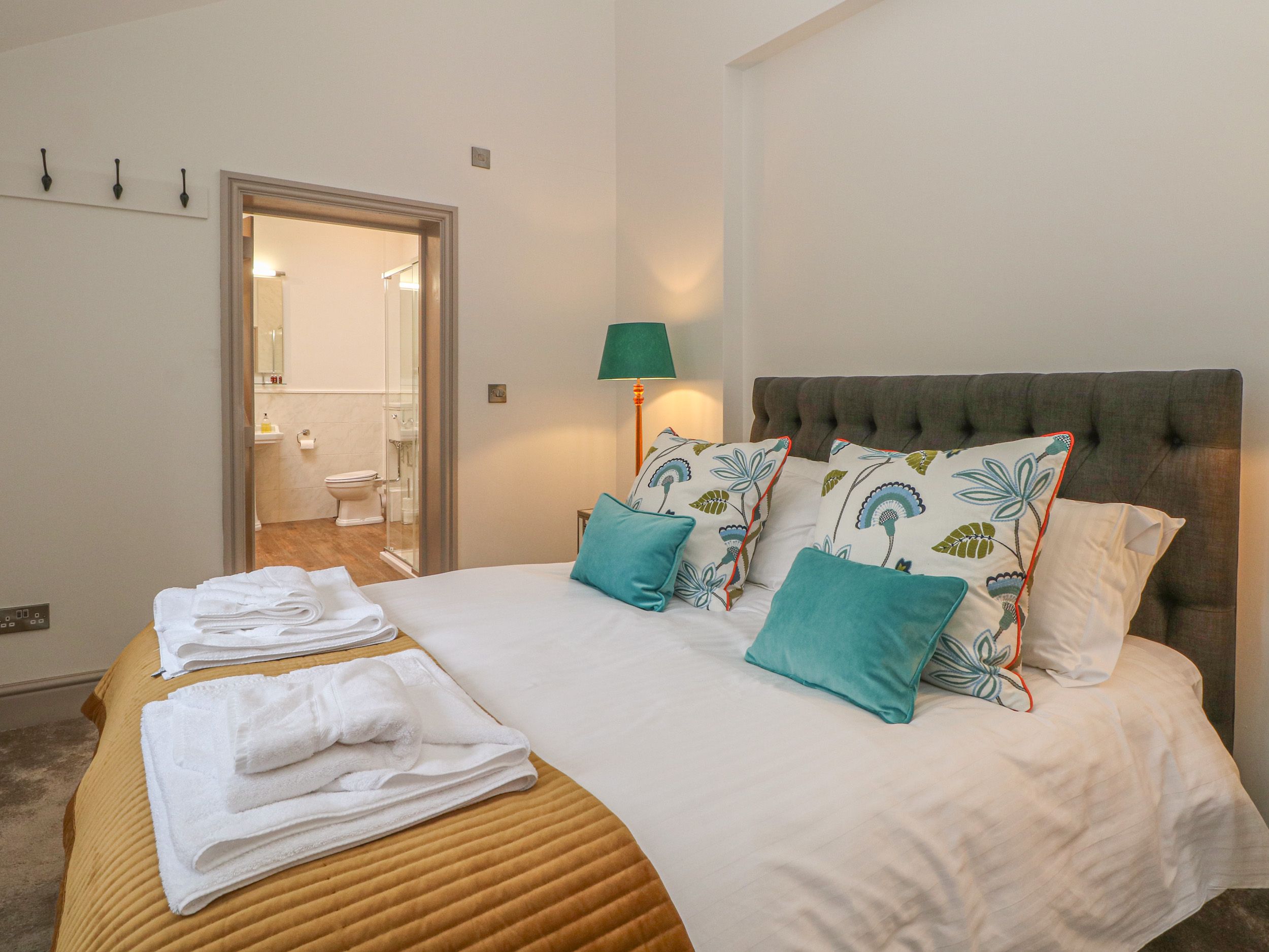 Over two floors, Two bedrooms: 1 x ground floor double with en-suite bathroom with roll-top bath, walk-in shower, basin and WC, 1 x first floor twin. Ground floor bathroom with walk-in shower, basin and WC. Kitchen with breakfast area. Sitting area adjoined to master bedroom