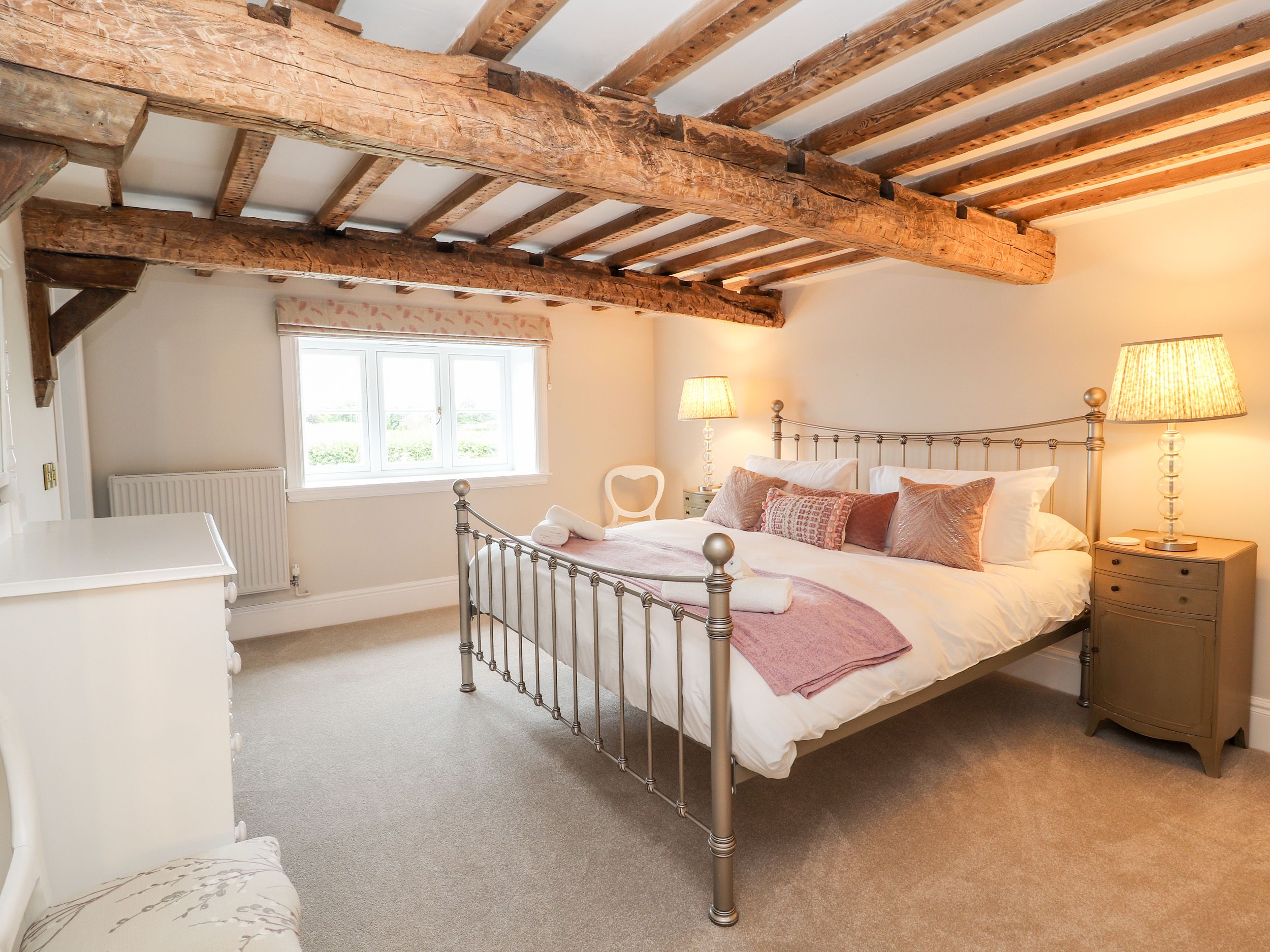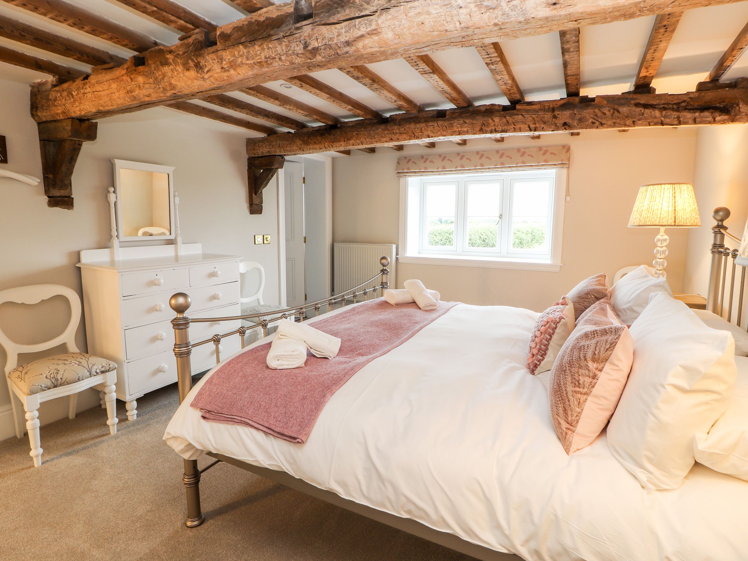 Holiday home Legh Oaks Farm is a luxury former farmhouse situated in High Legh, near Knutsford in Cheshire. The property has five bedrooms: a super-king-size, a king size, a ground-floor king-size and a zip/link twin - all of which have en-suites - plus a twin bedroom served by a family bathroom, sleeping 10 guests. There is a cloakroom, a kitchen/diner, utility cupboard, living/dining room with woodburning stove, snug and bar area. Outside there is ample off-road parking and an enclosed rear garden with a hot tub, boules court and basketball net. Legh Oaks Farm is a fantastic holiday home for a group gathering in peaceful Cheshire.