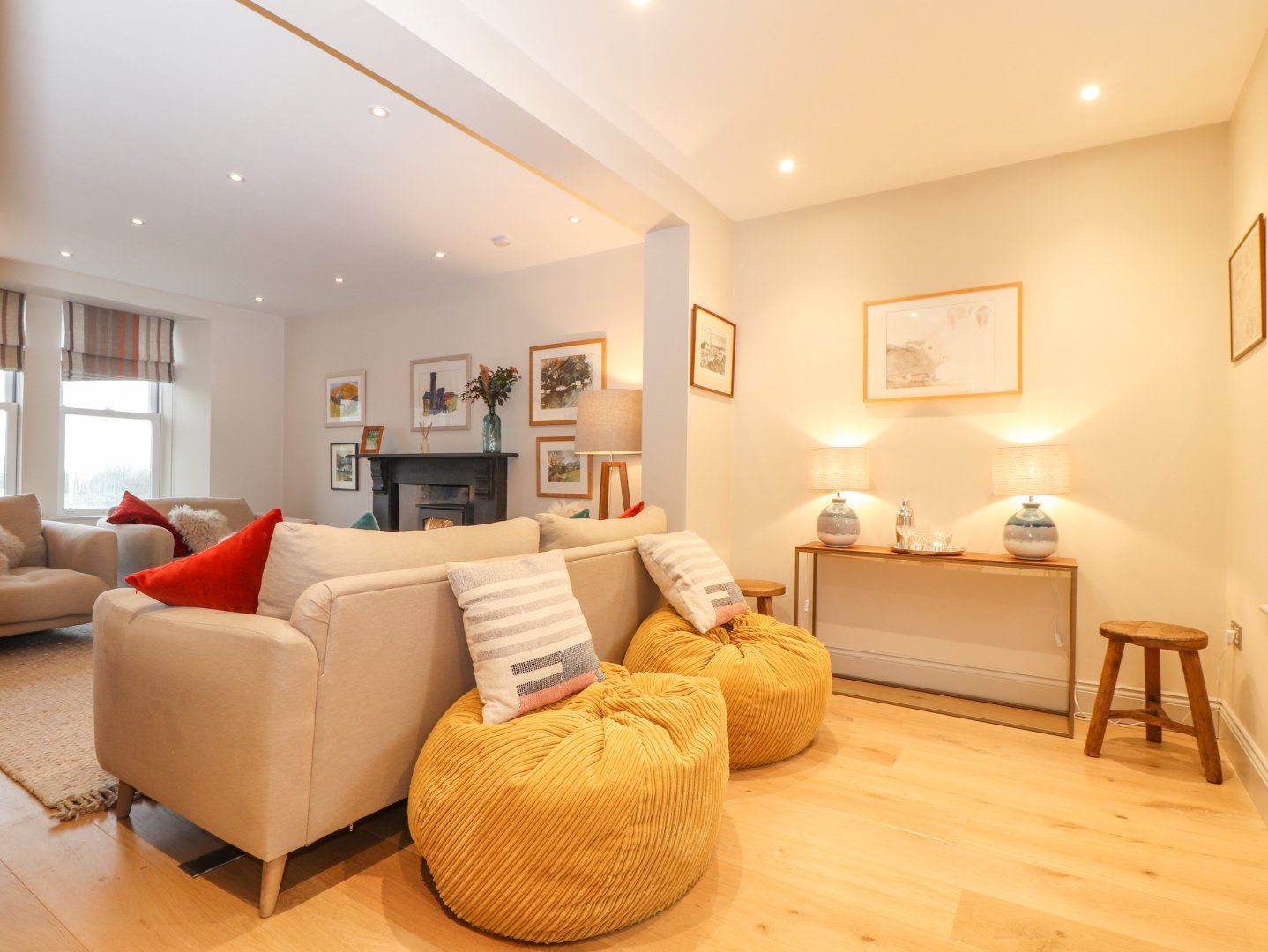 Accomodation Details Over three floors. Four bedrooms: 2 x super-king-size (zip/link, can be twins on request), 1 x king-size with en-suite roll-top bath, shower, basin and WC, 1 x second-floor family room with 5 x single beds (zip/link, can be super-king-size with 3 single beds). Bathroom with bath, walk-in shower, basin, and WC. Second-floor bathroom with bath, basin and WC. Cloakroom with basin and WC. Kitchen/diner with woodburning stove. Sitting room with woodburning stove. Study