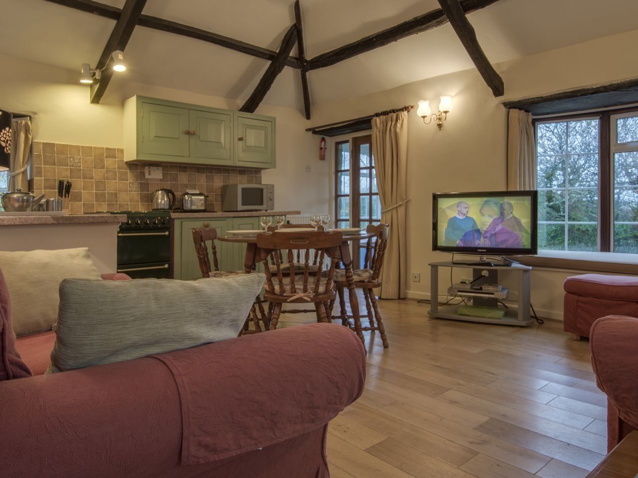 All ground floor. Two bedrooms: 1 x double, 1 x twin. Bathroom with bath, separate shower, WC, basin. WC with basin. Open plan living area with seating area with wood burning stove, dining area, kitchen. Games room.