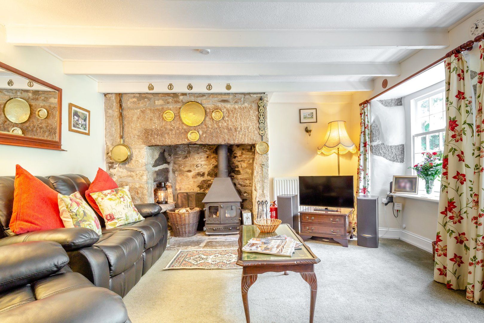 Two bedrooms: 1 x king-size double (zip/link, can be twin on request), 1 x double with Simba Hybrid mattress. Ground floor bathroom with bath, shower over, basin and WC. Shower room with shower, basin and WC. Kitchen. Utility. Sitting room with dining area, woodburner and electric coal-effect fire