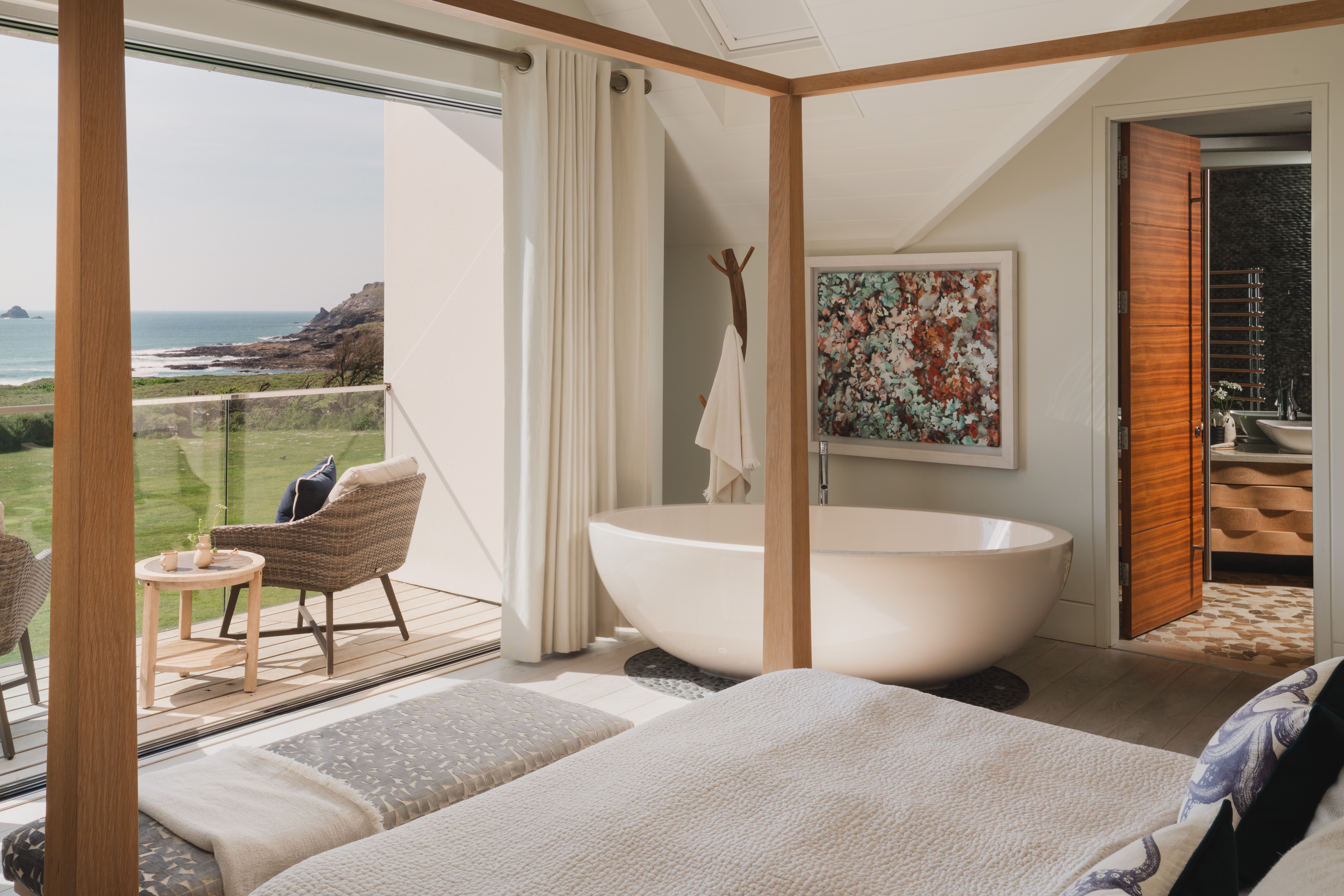 Experience the magic of the Cornish coast with a stay in this expansive beach house. You’ll be welcomed by sea views, locally sourced art, sculptures and designer furnishings. There’s plenty of space for socialising as well as cosy evenings by the wood burning fire or movie nights in the cinema room. All of the bedrooms come with sea views and three of them feature freestanding bathtubs – perfect for unwinding after a day of exploring. Outside, there’s a terrace, a barbecue and a garden path leading directly to Booby's Bay beach. From here, you can join the South West Coastal Path and it’s just a ten-minute drive into Padstow. There's also a golf course right next door.