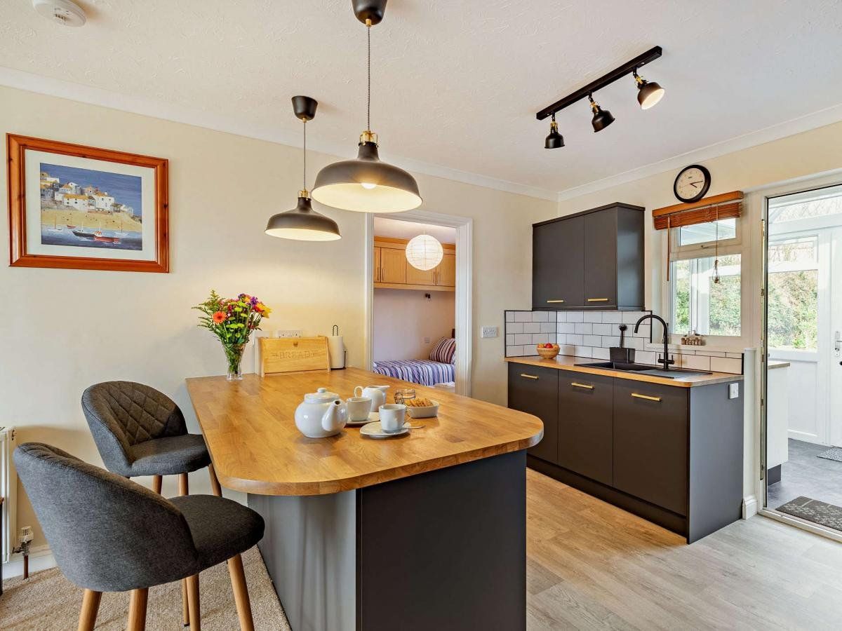 Admire far-reaching views across the garden out to the sea in the light and bright open-plan kitchen/living/dining room, sweeping from the front to the rear of the cottage, creating the perfect relaxing space to socialise all evening long. Refuel around the compact dining table or breakfast bar in the well-equipped kitchen area after a hike along the South West Coast Path.