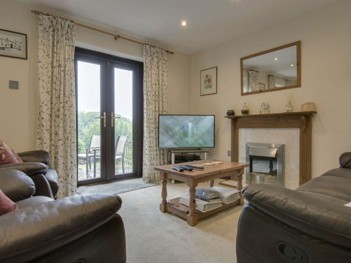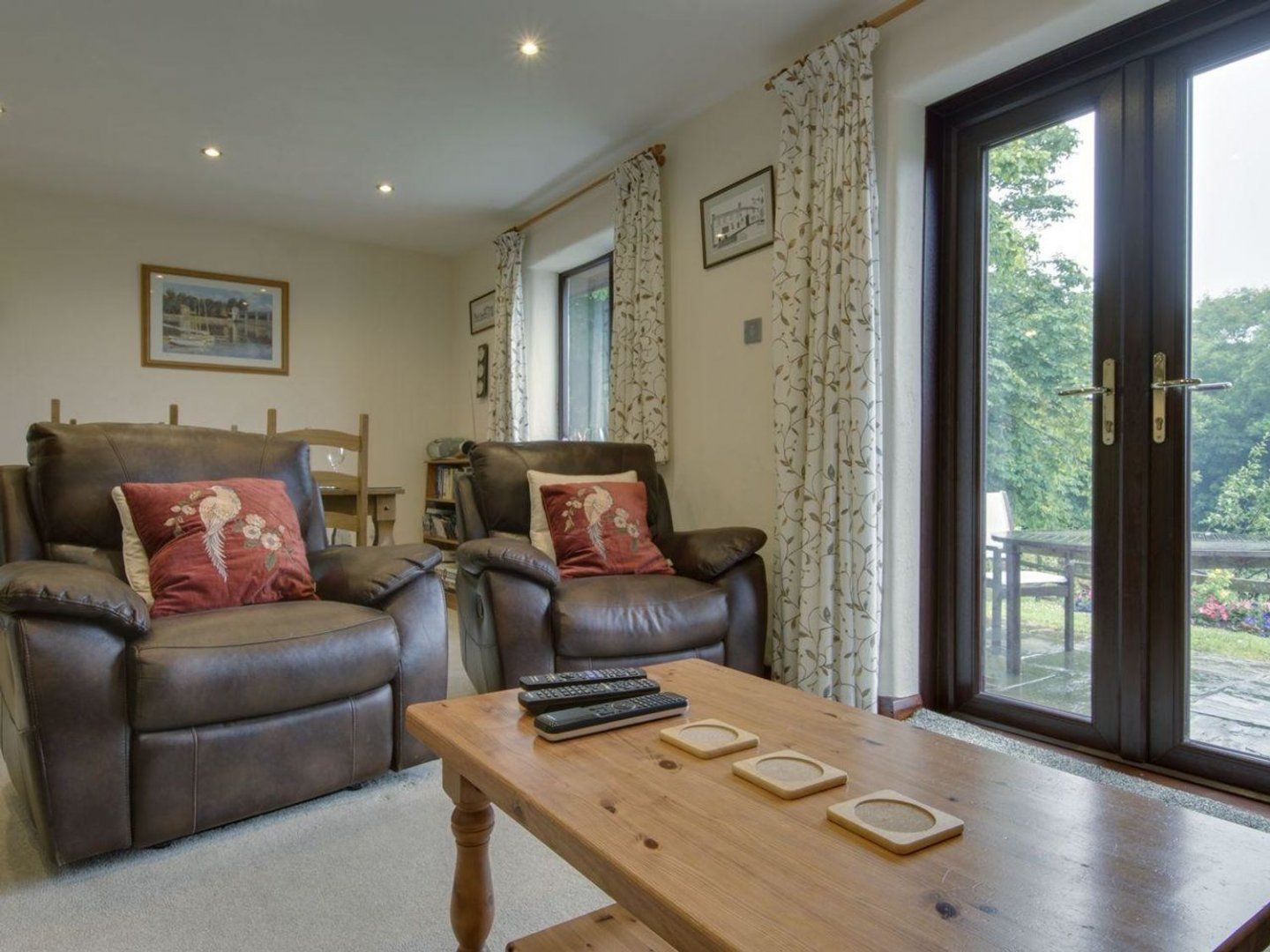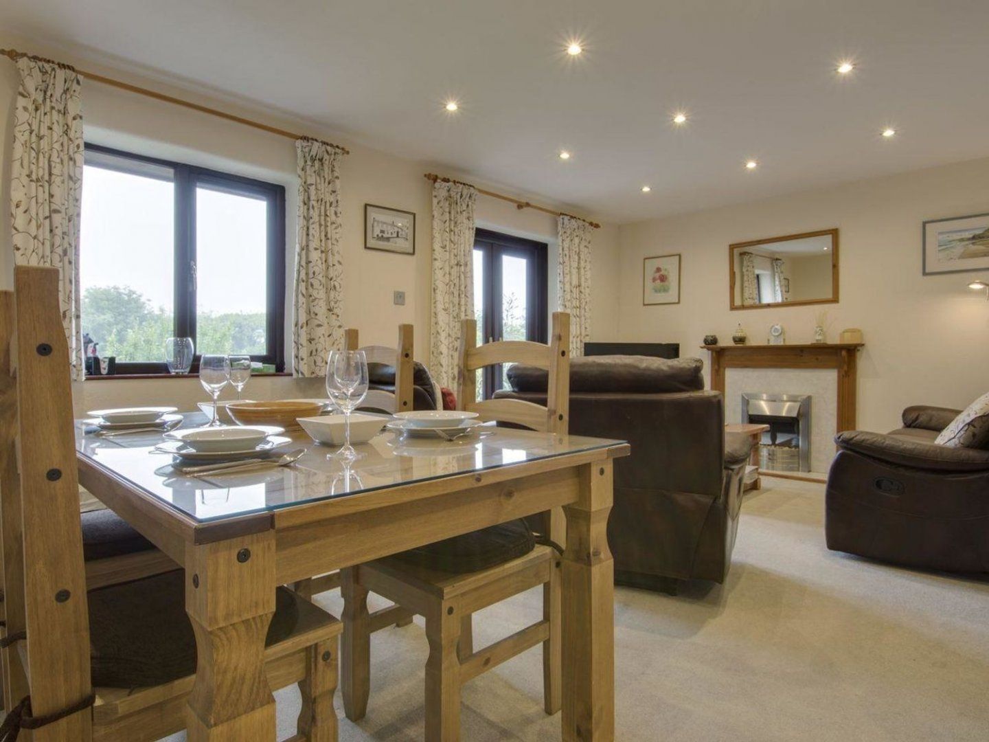 All ground floor. Two bedrooms: 1 x double, 1 x twin. Open-plan living area with sitting area, kitchen, dining area and glazed doors to patio. Bathroom with bath, hand-held shower and basin. Separate WC and basin.
