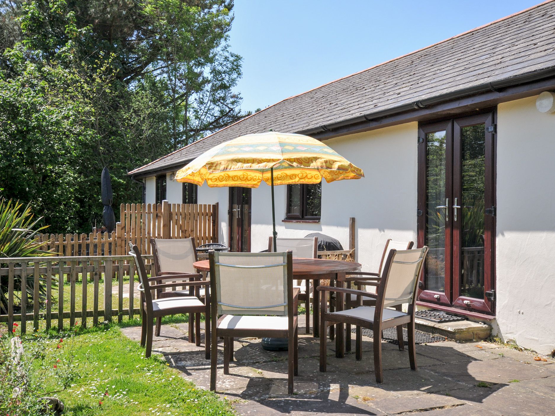Accomodation Details All ground floor. Two bedrooms: 1 x double, 1 x twin. Open-plan living area with sitting area, kitchen, dining area and glazed doors to patio. Bathroom with bath, hand-held shower and basin. Separate WC and basin.
