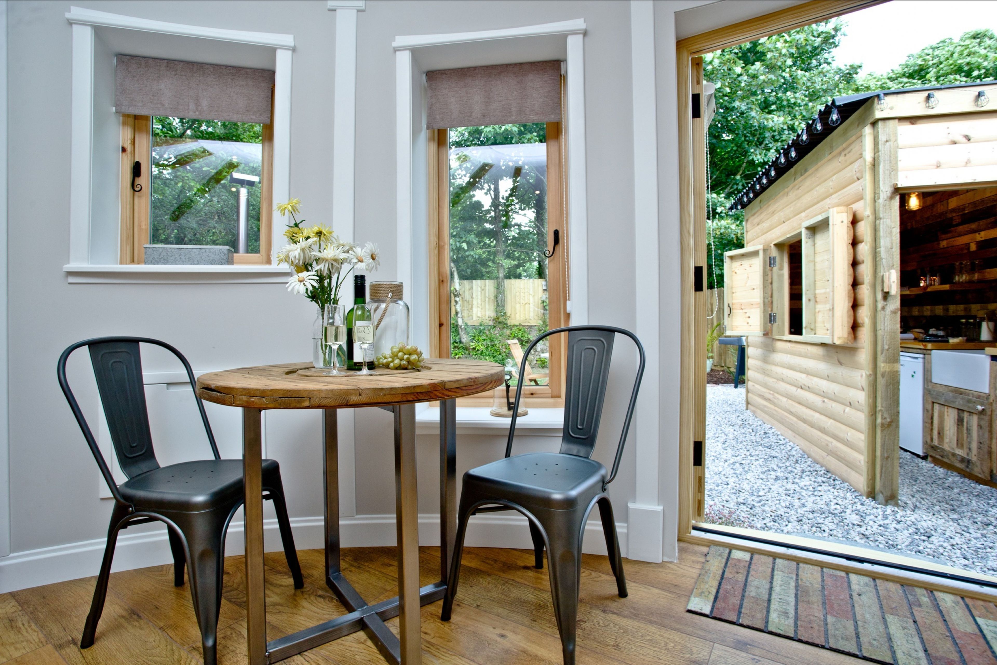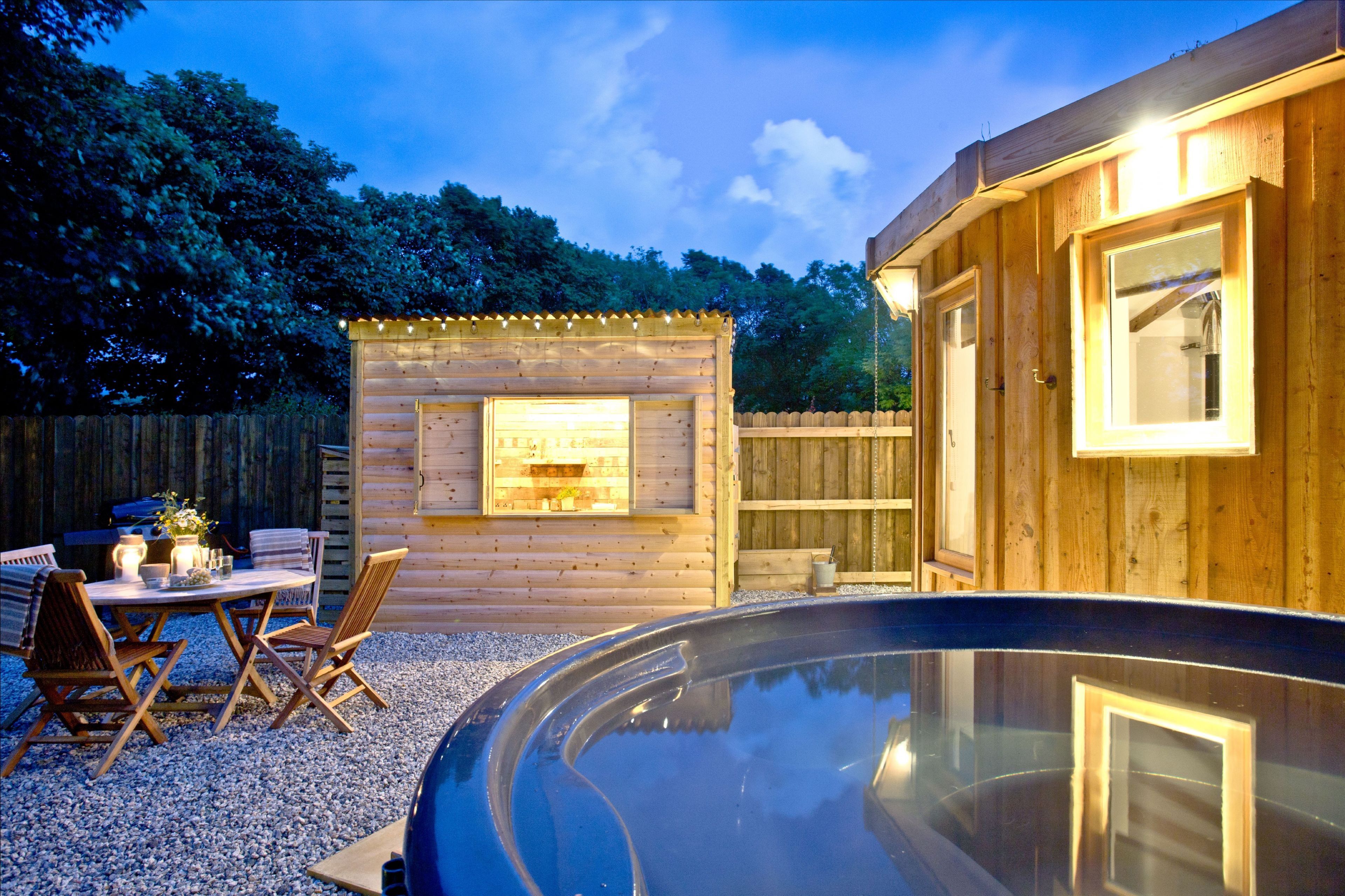 Outdoors Private enclosed garden with a wood-fired hot tub, patio with a table and chairs and a wooden kitchen cabin. Parking on site.