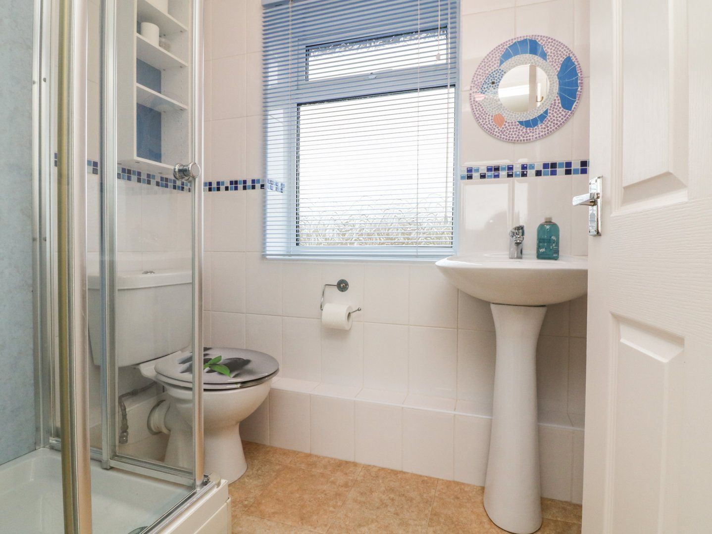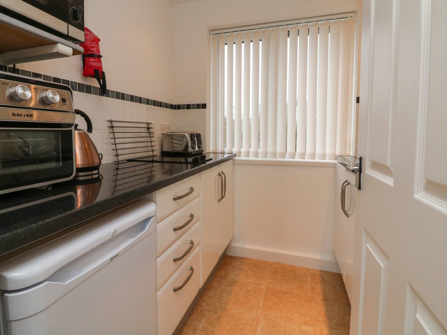 Accomodation Details First-floor apartment. Studio-style layout with double sofa bed and dining area. Shower room with walk-in shower, basin, and WC. Kitchen