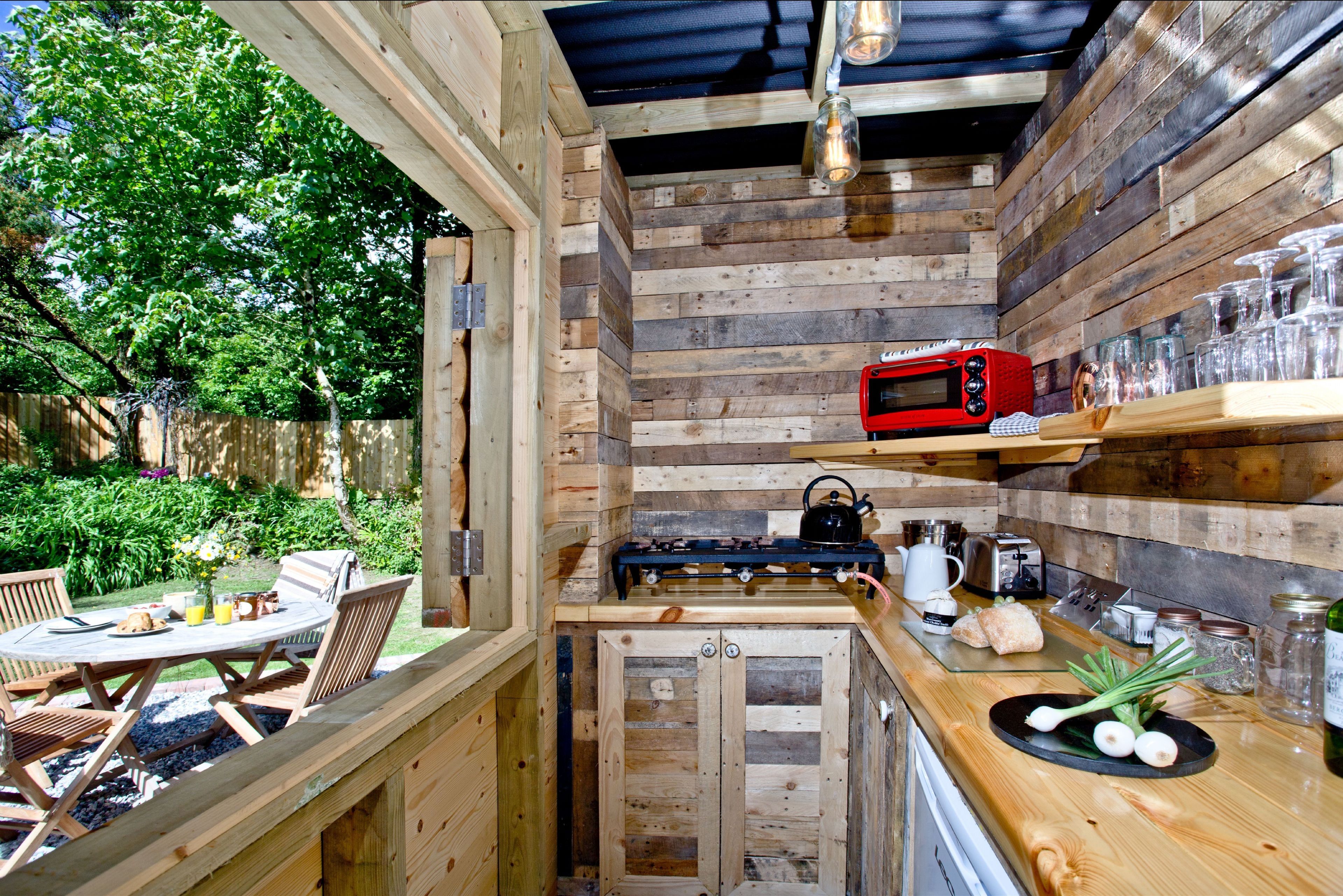 Outdoors Private enclosed garden with a wood-fired hot tub, patio with a table and chairs and a wooden kitchen cabin. Plenty of parking on site.