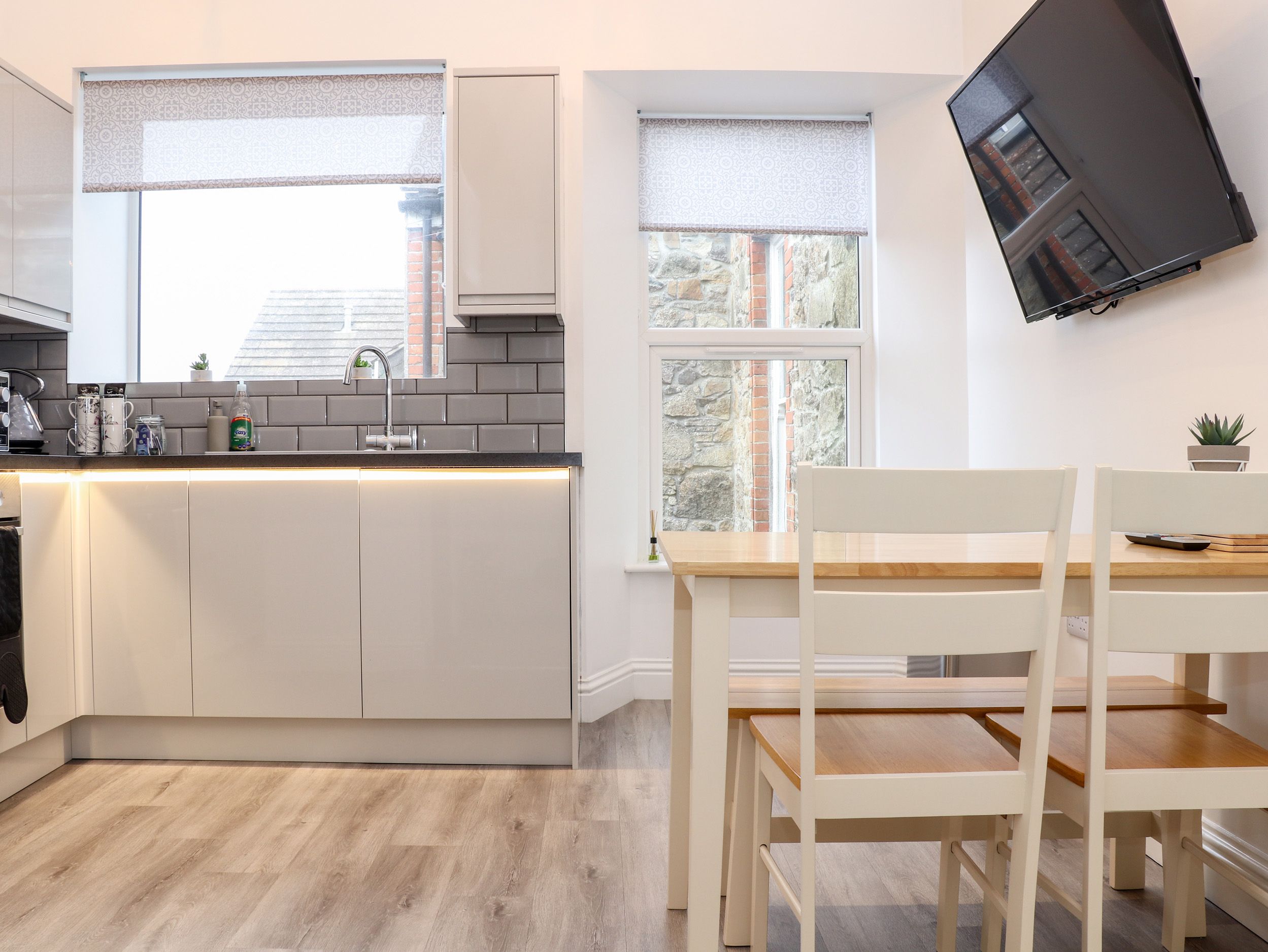 First-floor apartment. One super-king-size bedroom (zip/link, can be twin on request) with Smart TV with Netflix and en-suite walk-in shower, basin, heated towel rail and WC. Kitchen/diner with Smart TV with Netflix